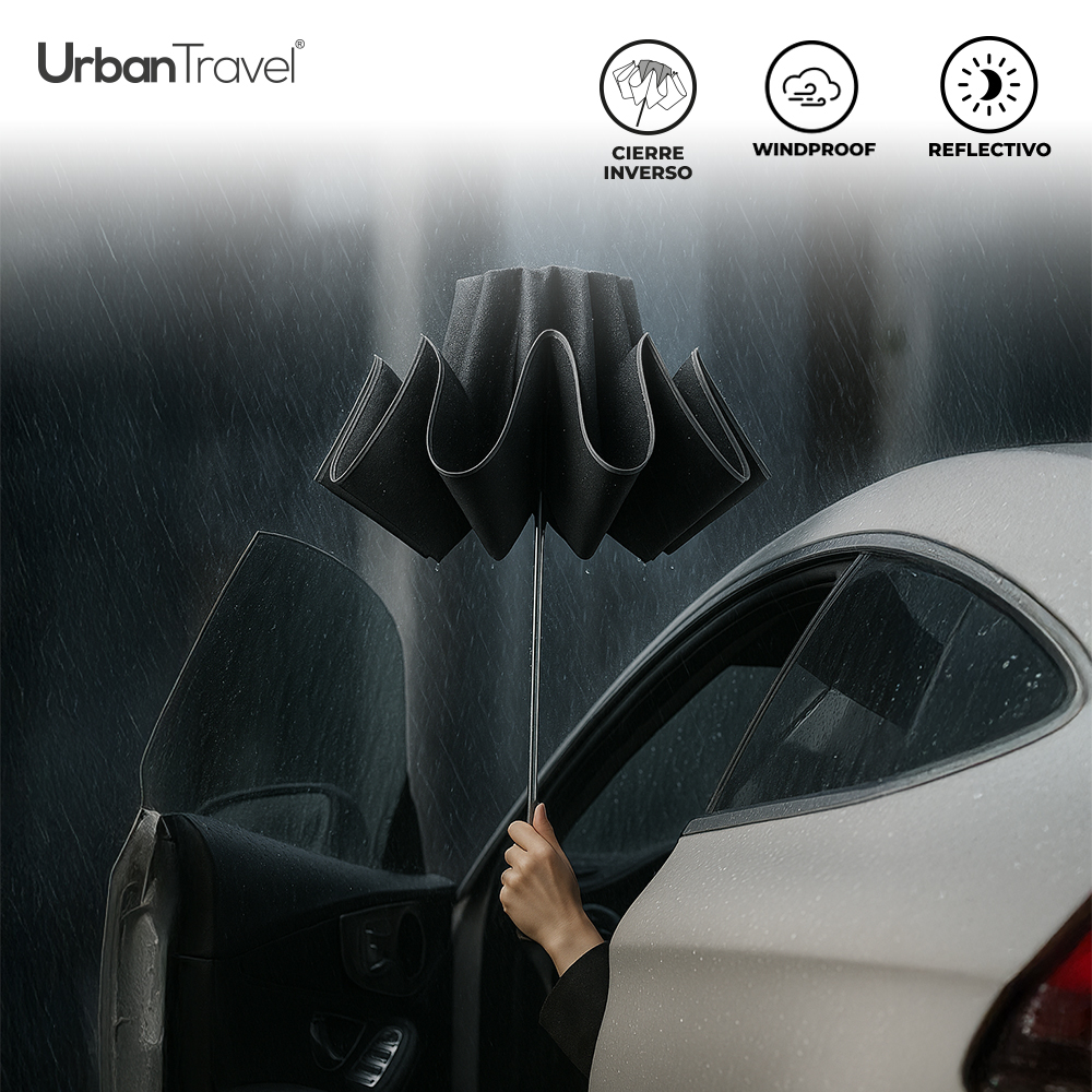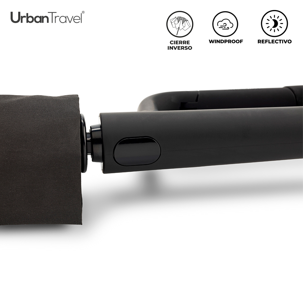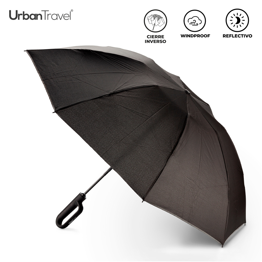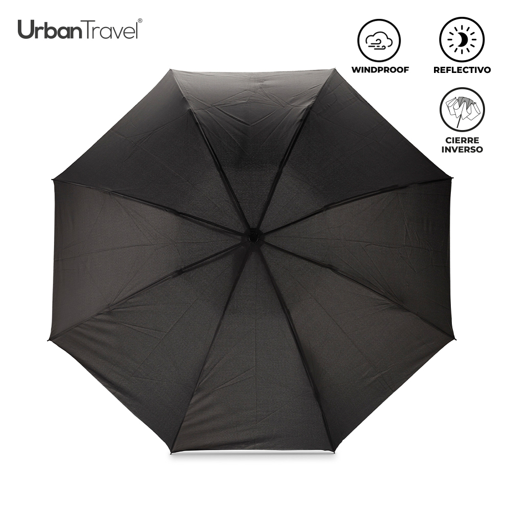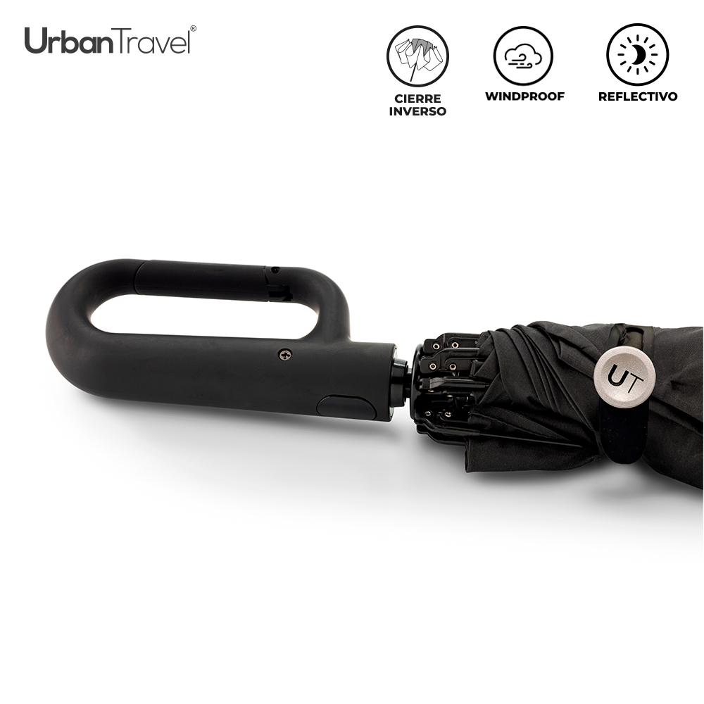 Paraguas plegable en poliéster RPET pongee 190T con herraje en aluminio y bordes reflectivos. Apertura y cierre automático, 8 cascos. Mango tipo carabinero en caucho para poderlo colgar. Incluye funda reciclada RPET.