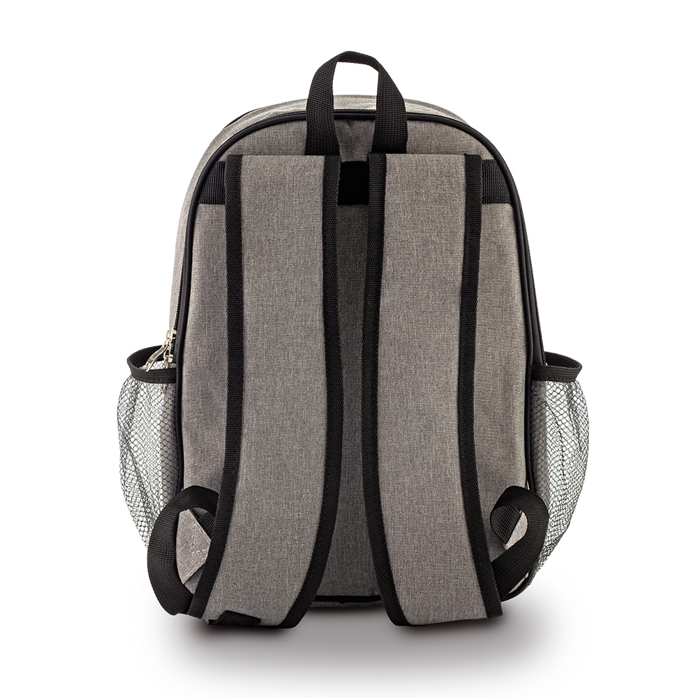 Morral backpack en poliéster de dos compartimentos, uno tipo nevera cooler con interior en PVC, otro con 17 accesorios para picnic. Bolsillo adicional sin cremallera, dos mallas laterales.