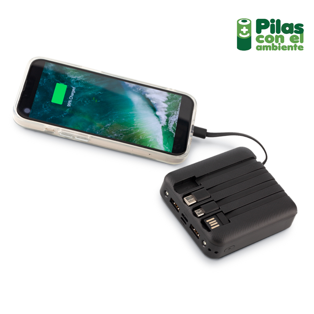 Pila recargable de emergencia de 5000 mAh con luz led. Cables con conectores lightning, Micro, USB y Tipo C, con alimentación de energía mediante puerto USB, Tipo C, Micro. 4 luces indicadoras del estado de carga.