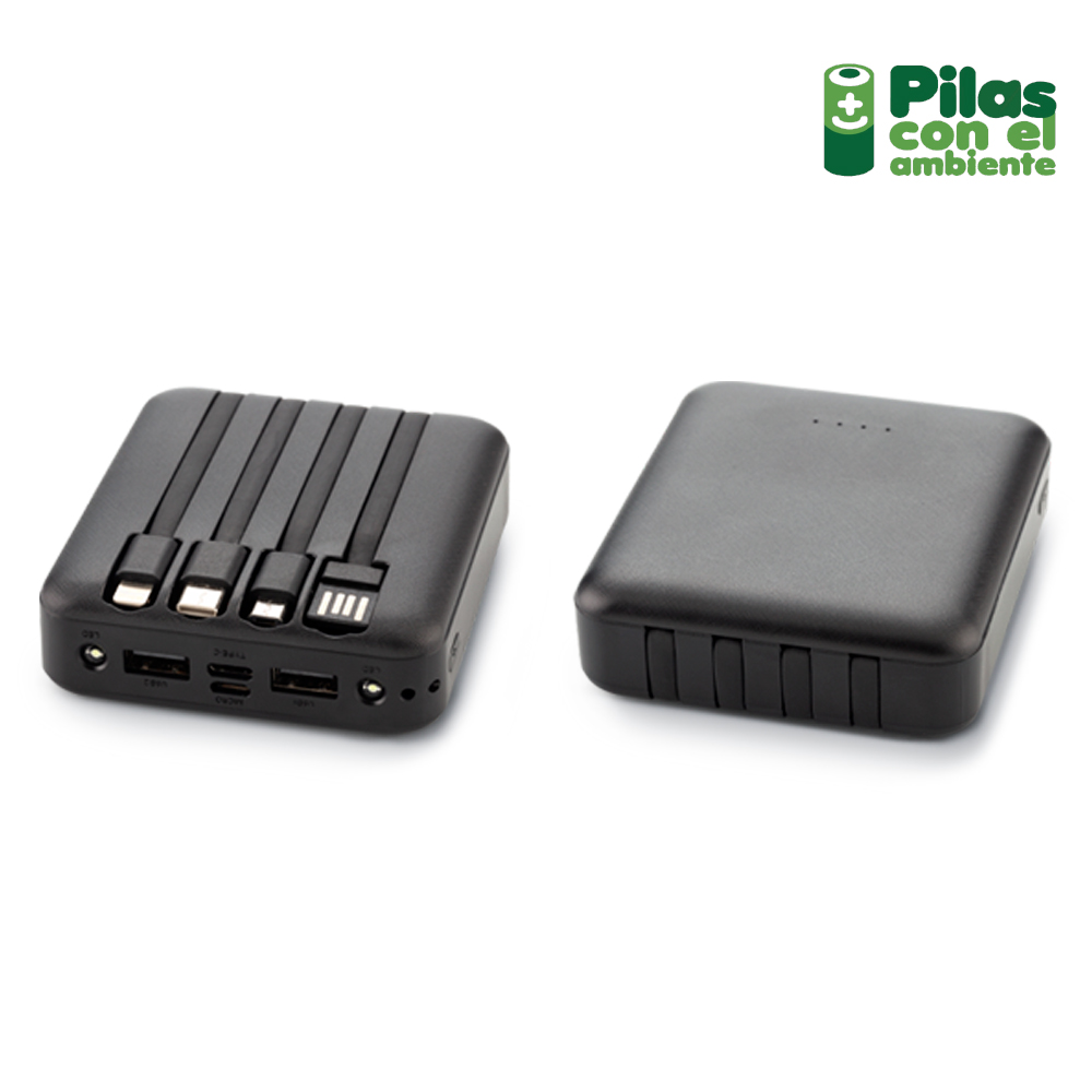 Pila recargable de emergencia de 5000 mAh con luz led. Cables con conectores lightning, Micro, USB y Tipo C, con alimentación de energía mediante puerto USB, Tipo C, Micro. 4 luces indicadoras del estado de carga. Empaque Caja Individual. Medidas: 8 cm x 9 cm x 2 cm Marca: 5 cm / Tampografía