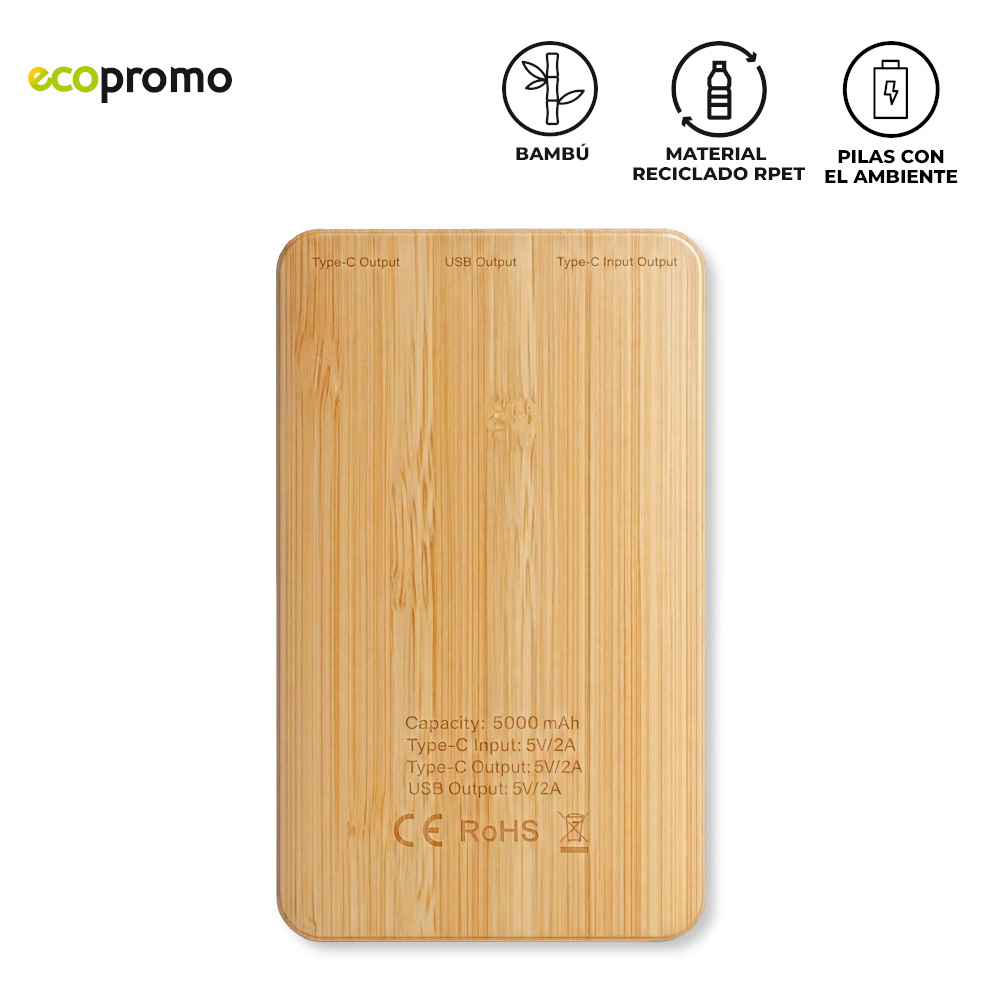 Pila recargable en bambú y poliéster reciclado RPET de 5000 mAh. Incluye cable tipo C para carga. Medidas: 9.5 cm x 6.2 cm x 1.6 cm. Marca: 5 cm / Tampografía / Láser.