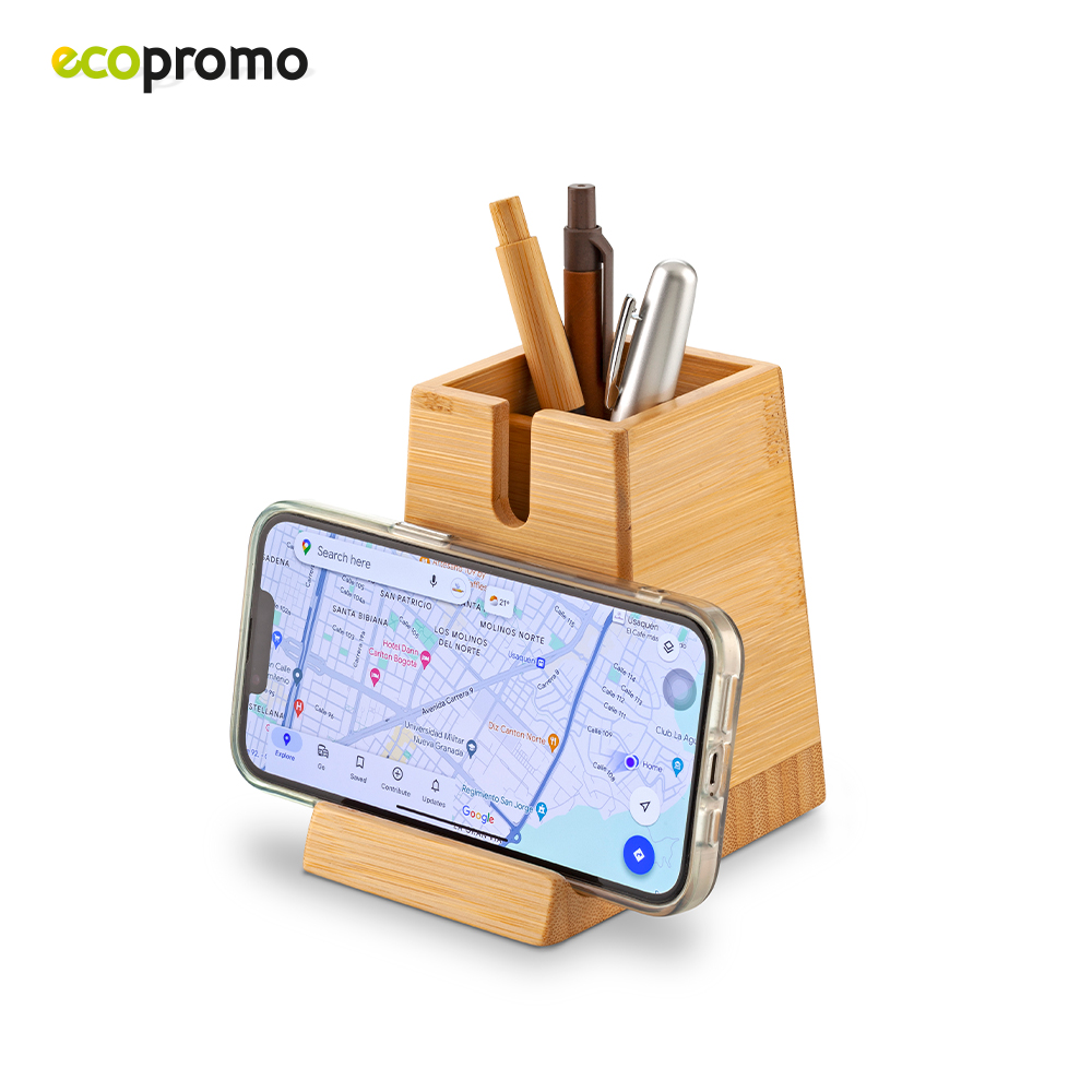 Portabolígrafos en bambú con soporte para celular.