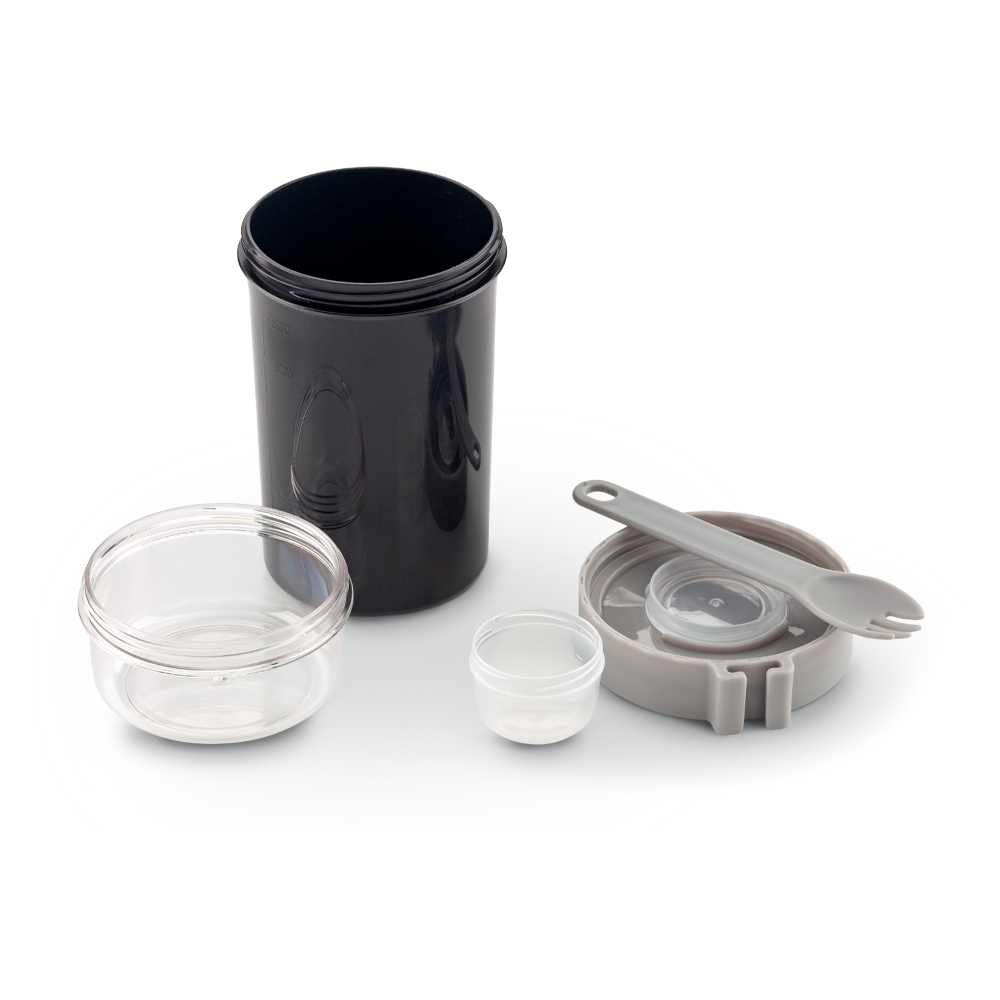 Portacomidas plástico con un recipiente grande, uno mediano y uno pequeño. Incluye cuchara. Empaque caja individual. Medidas: 19 cm x 8 cm. Marca: 4 cm / Tampografía.