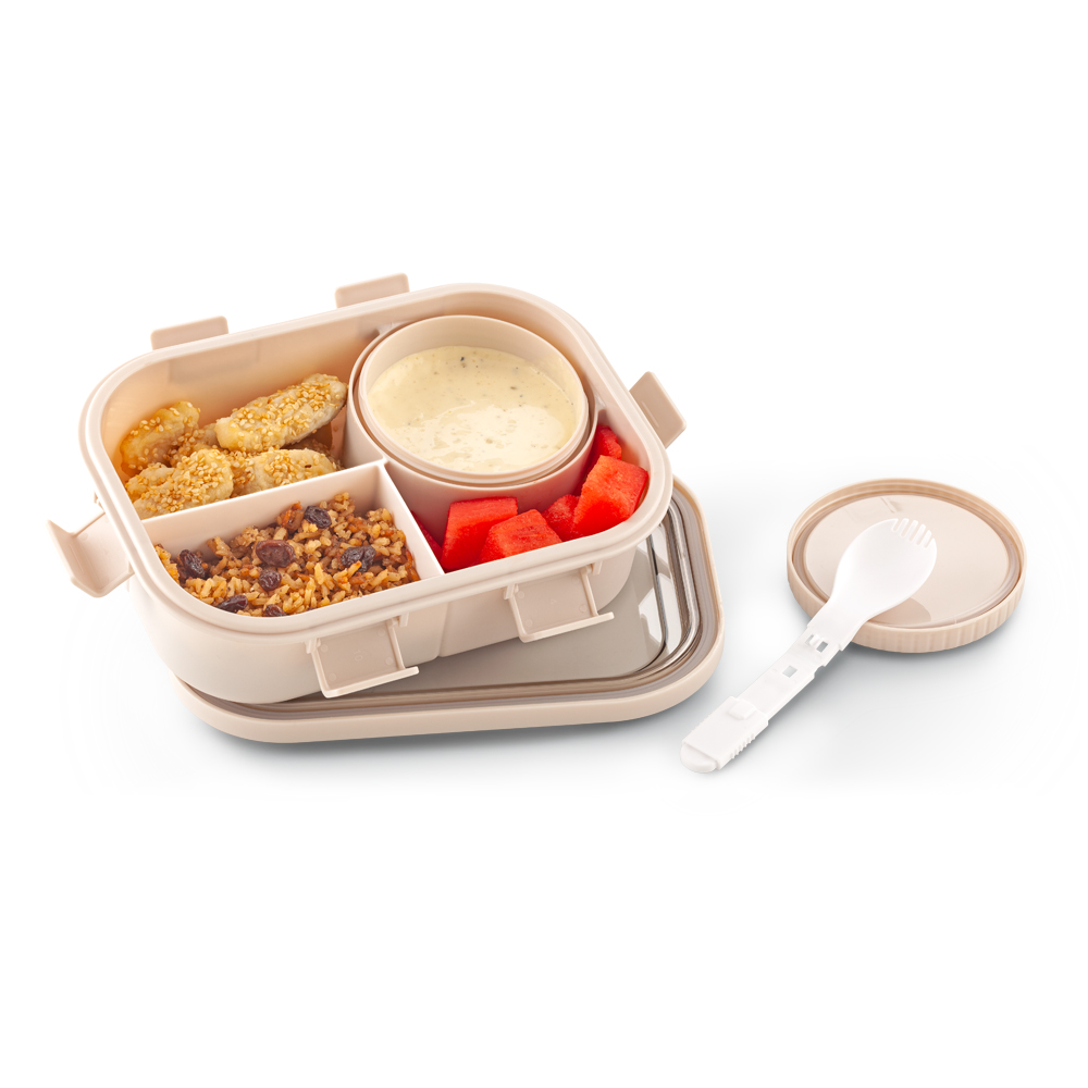 Portacomidas plástico con cuatro compartimientos, un compartimiento adicional con tapa y una cuchara / tenedor plegable.