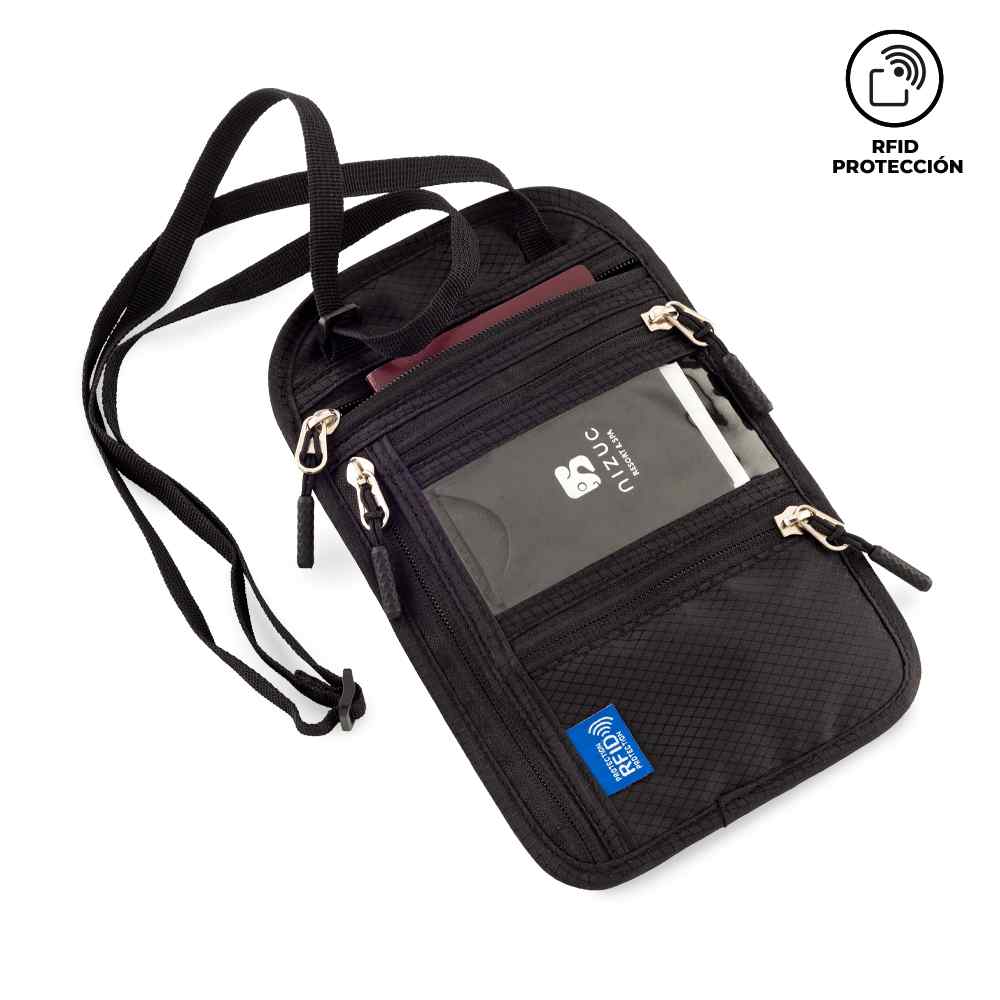 Portadocumentos para viaje en lona poliester, con 4 bosillos externos con cremallera y un bolsillo en la parte posterior. Su material interno permite bloquear las señales electromagnéticas RFID (Radio Frequency Indentification) que se usan en tarjetas de chip, pasaportes, tarjetas electrónicas de transporte, etc.