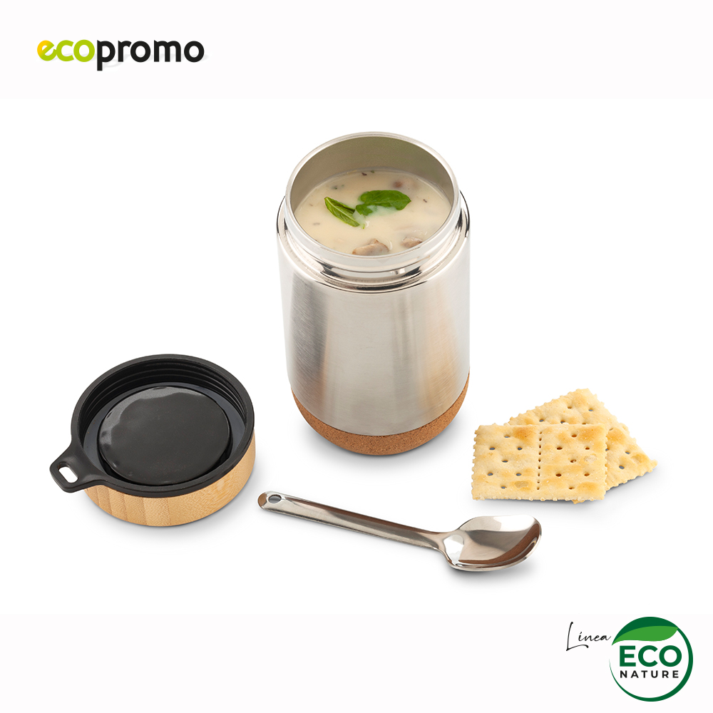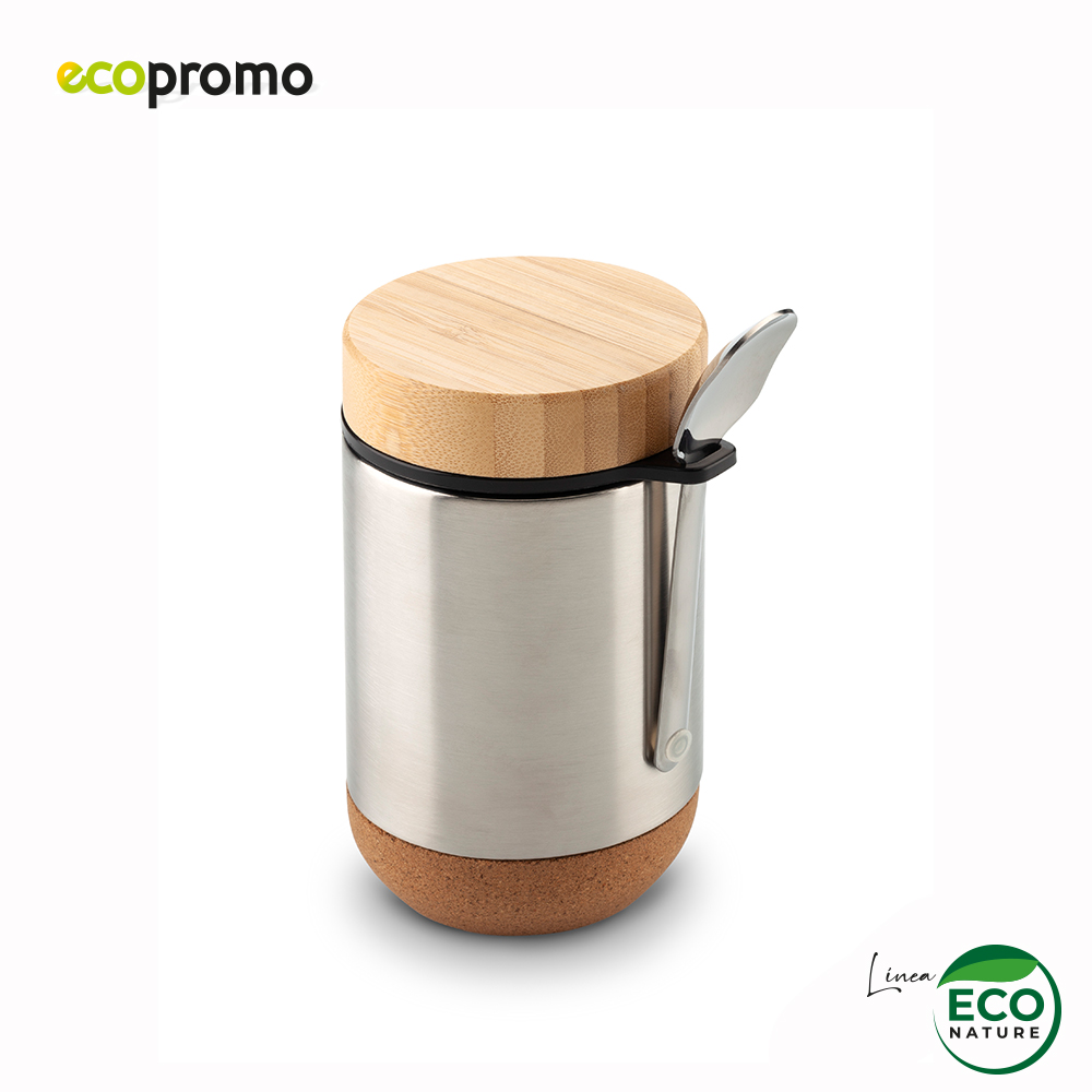 Portalíquido metálico en acero inoxidable doble pared, tapa rosca plástica y en bambú, y base en corcho. Incluye cuchara metálica. Empaque caja individual.