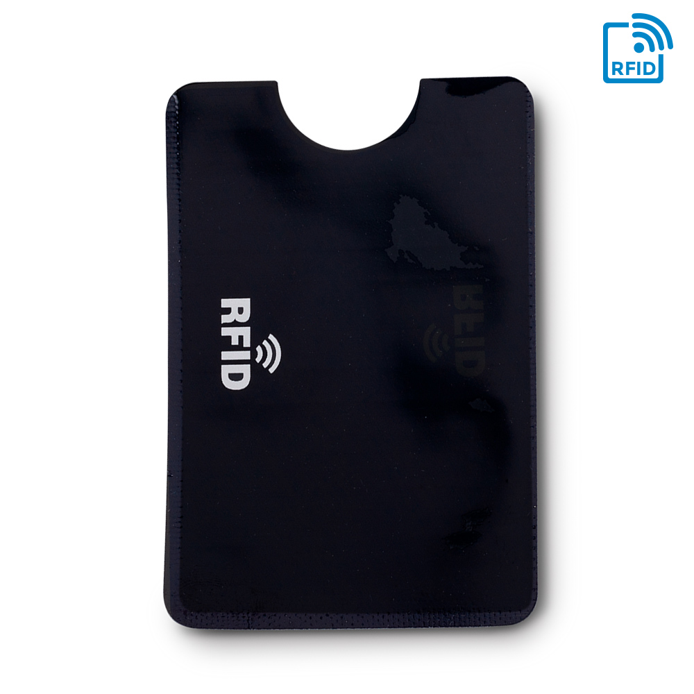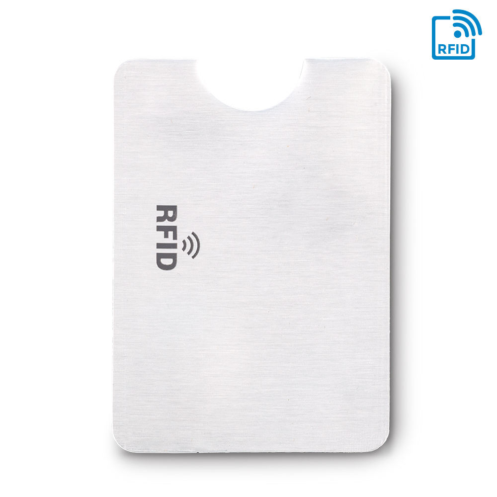 Portatarjetas de un compartimento, elaborado en material laminado y aluminio en el interior. Su material interno permite bloquear las señales electromagnéticas RFID (Radio Frequency Identification) que se usan en tarjetas de chip, tarjetas electrónicas de transporte, etc.