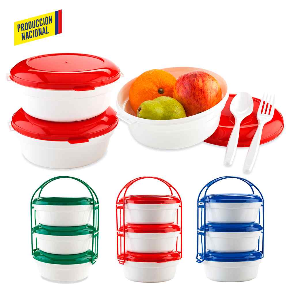 Set de portacomidas por 3 unidades en polipropileno, apilables para fácil almacenaje. Medidas: Taza plástica: 7.5 cm x 17.5 cm diámetro. Portacomidas armado: 27 cm x 17.5 cm diámetro Marca: 4.5 cm (1 taza) / Screen
