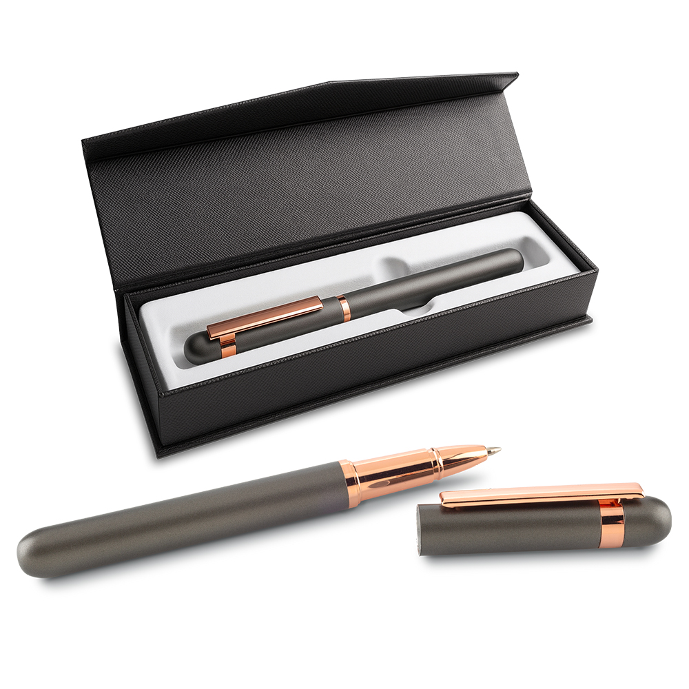 Bolígrafo metálico tipo roller. Empaque caja individual.