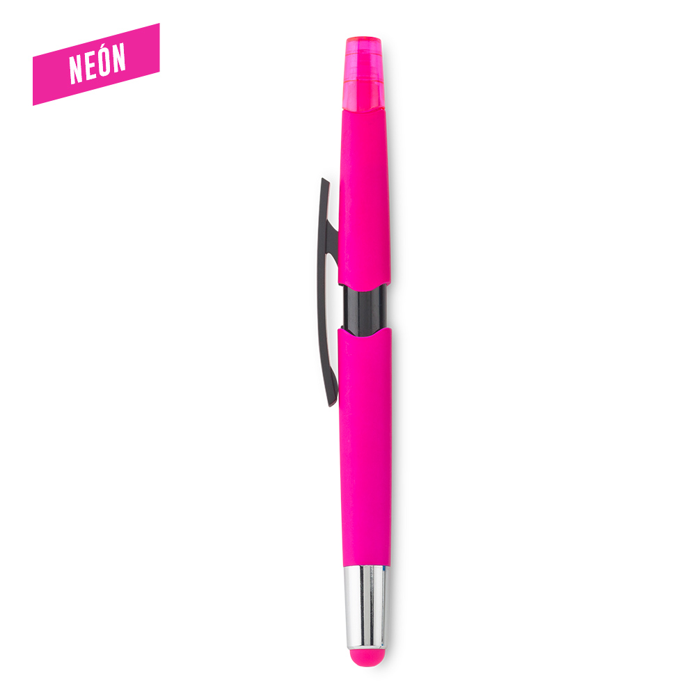 Bolígrafo plástico. Stylus en la punta y mecanismo push. Resaltador de tinta. Medidas: 14 cm Marca: 2.5 cm / Tampografía