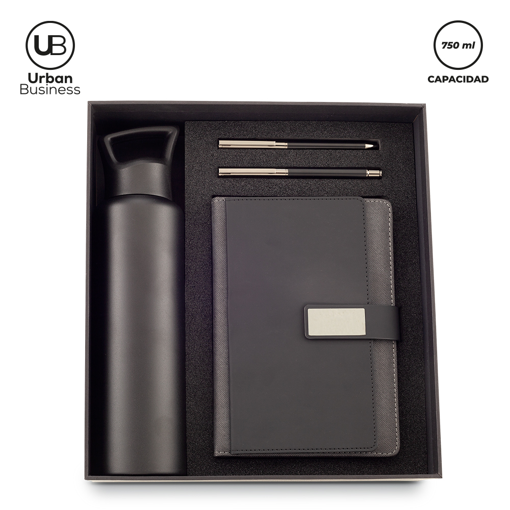 Set de libreta de 21 cm x 14.5 cm de 96 hojas rayadas. Cubierta en poliuretano, clip con imán y con porta documentos. Botilito de 750 ml doble pared en acero inoxidable. Un bolígrafo metálico con mecanismo twist y un bolígrafo metálico tipo roller.
