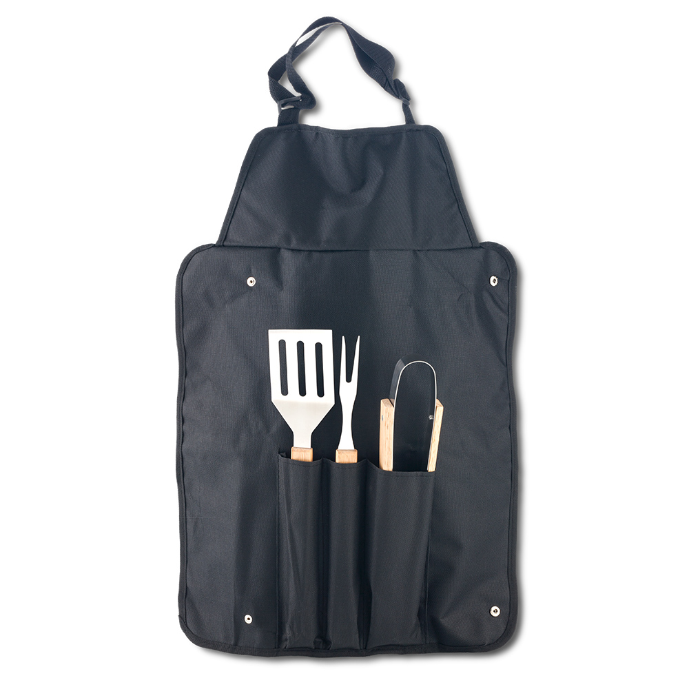 Set de BBQ con 3 utensilios metálicos (pinzas, trinche, espátula). Estuche delantal en lona.