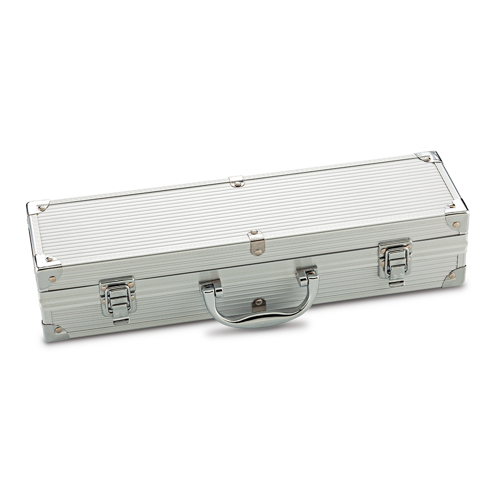 Caja de aluminio con trinche, espátula y pinzas. Medidas Estuche: 36.7 cm x 9.7 cm x 7.7 cm Marca: 4 cm / Láser (Líquido Oxidante)