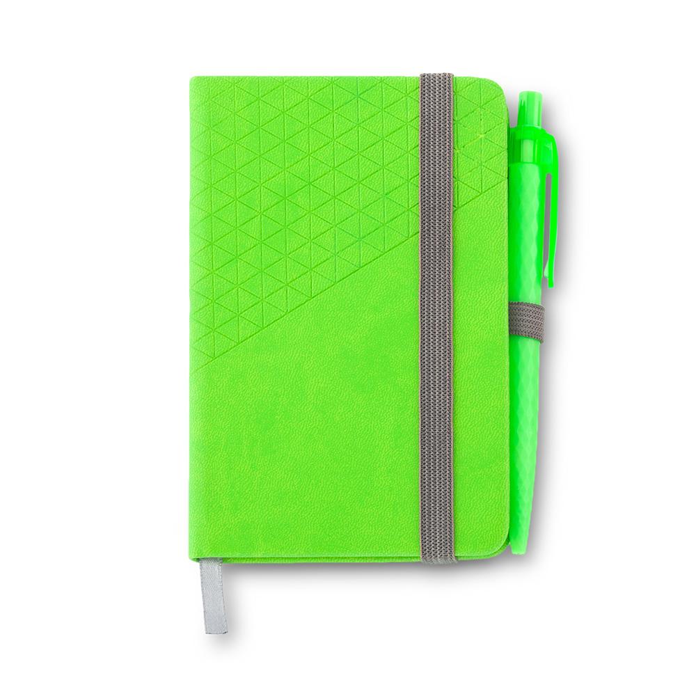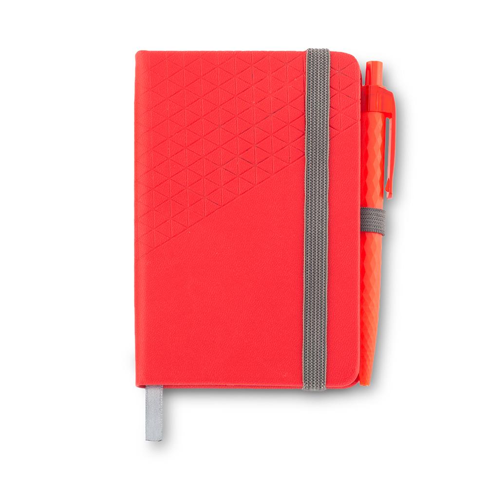 En poliuretano. Con bolígrafo plástico. 80 hojas con rayas. Empaque caja individual. Medidas: Estuche: 15.6 cm x 12.3 cm x 1.9 cm / Libreta: 14 cm x 9 cm x 1.3 cm Marca: 4 cm / Tampografía, producto con tratamiento