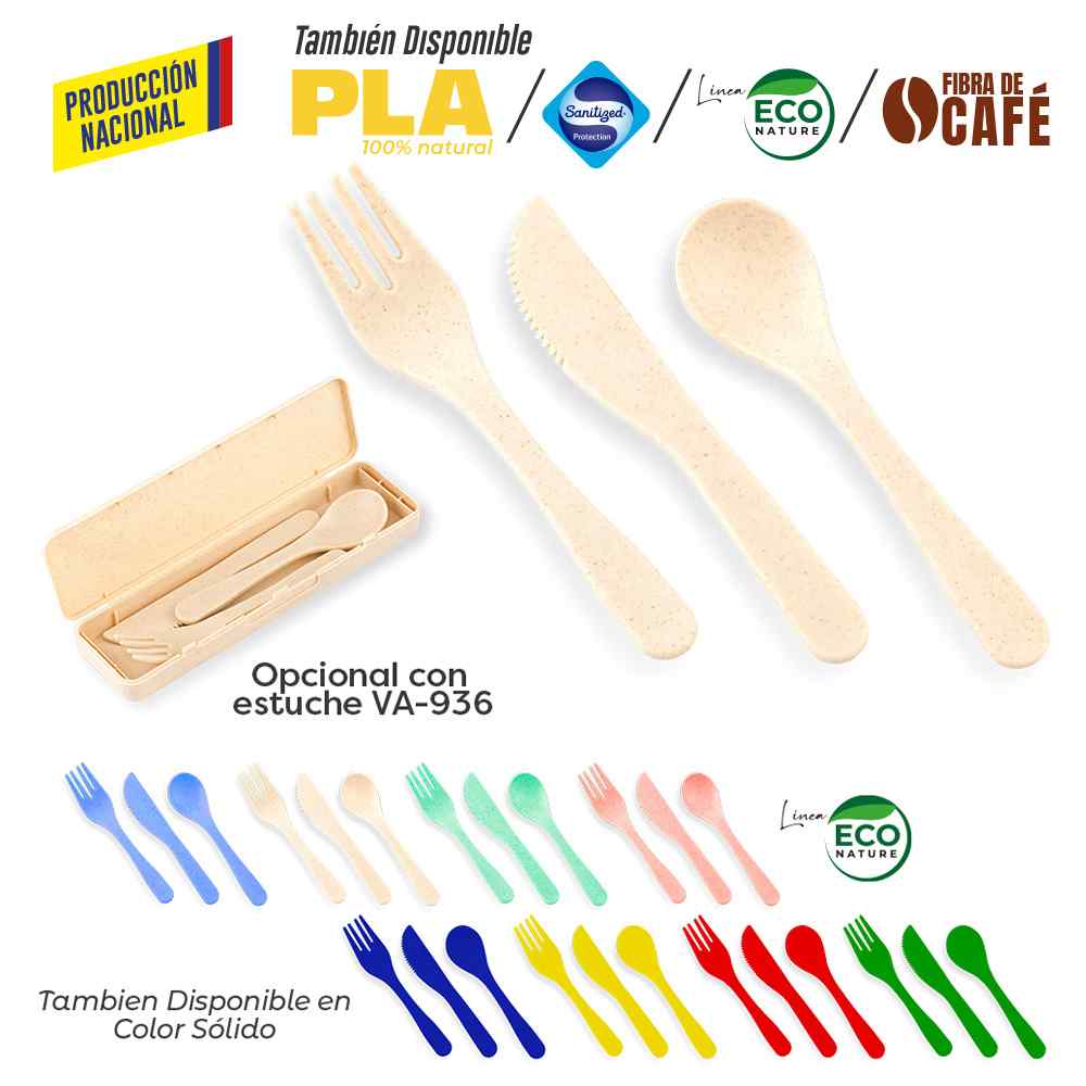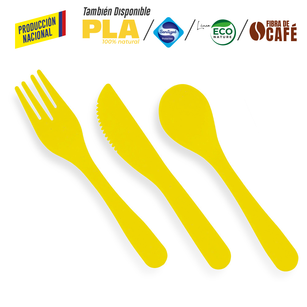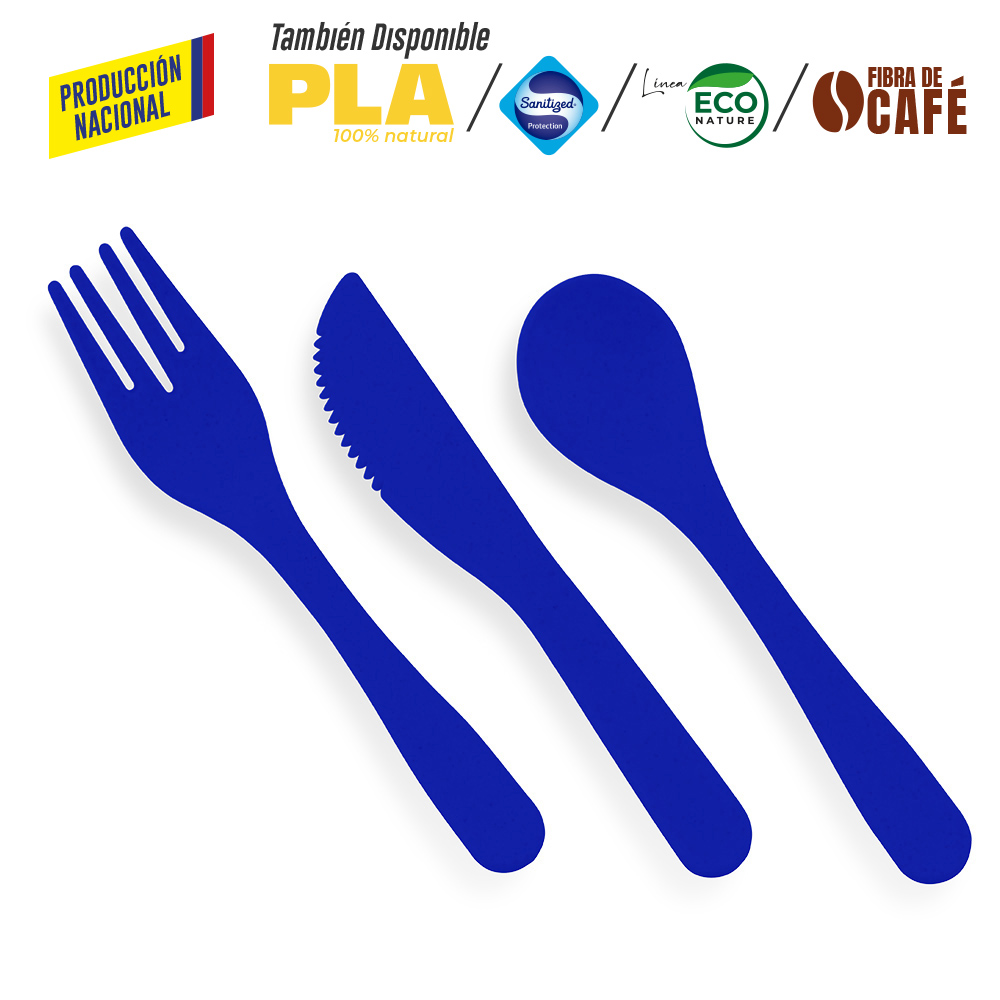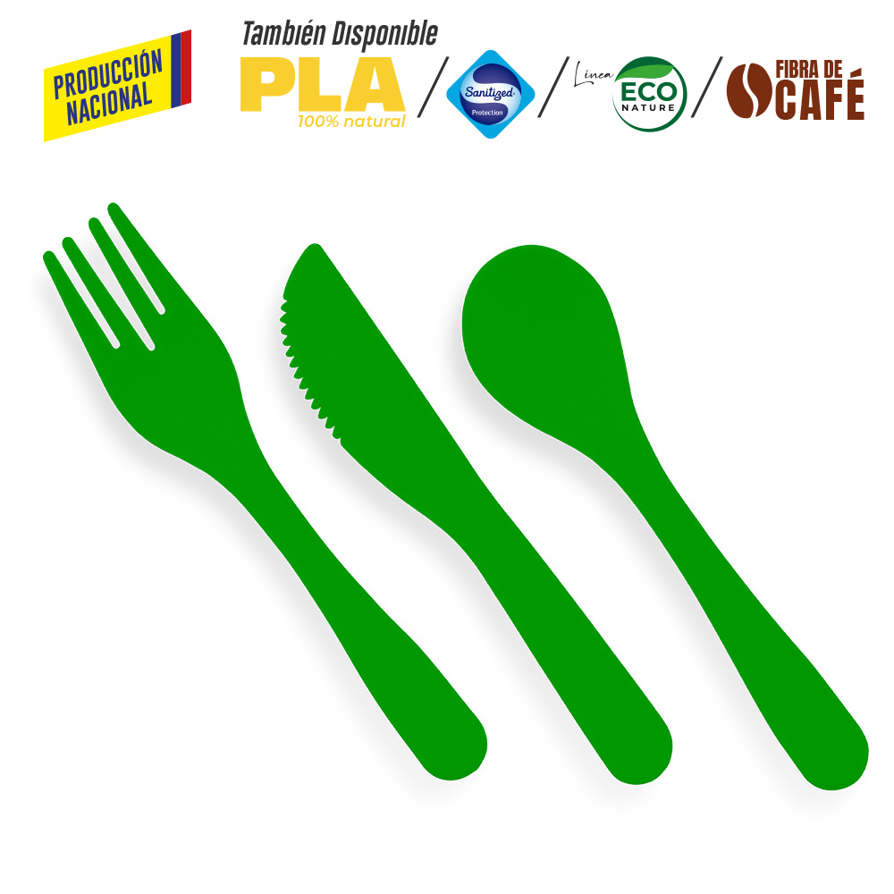 En plástico, incluye cuchara, tenedor y cuchillo. Se vende por set.