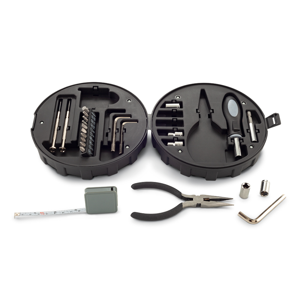 Set de herramientas de 24 piezas en estuche plástico. Cierre a presión. Empaque caja individual. Medidas Cerrado: 16 cm x 5.8 cm. Marca: 4 cm / Tampografía.
