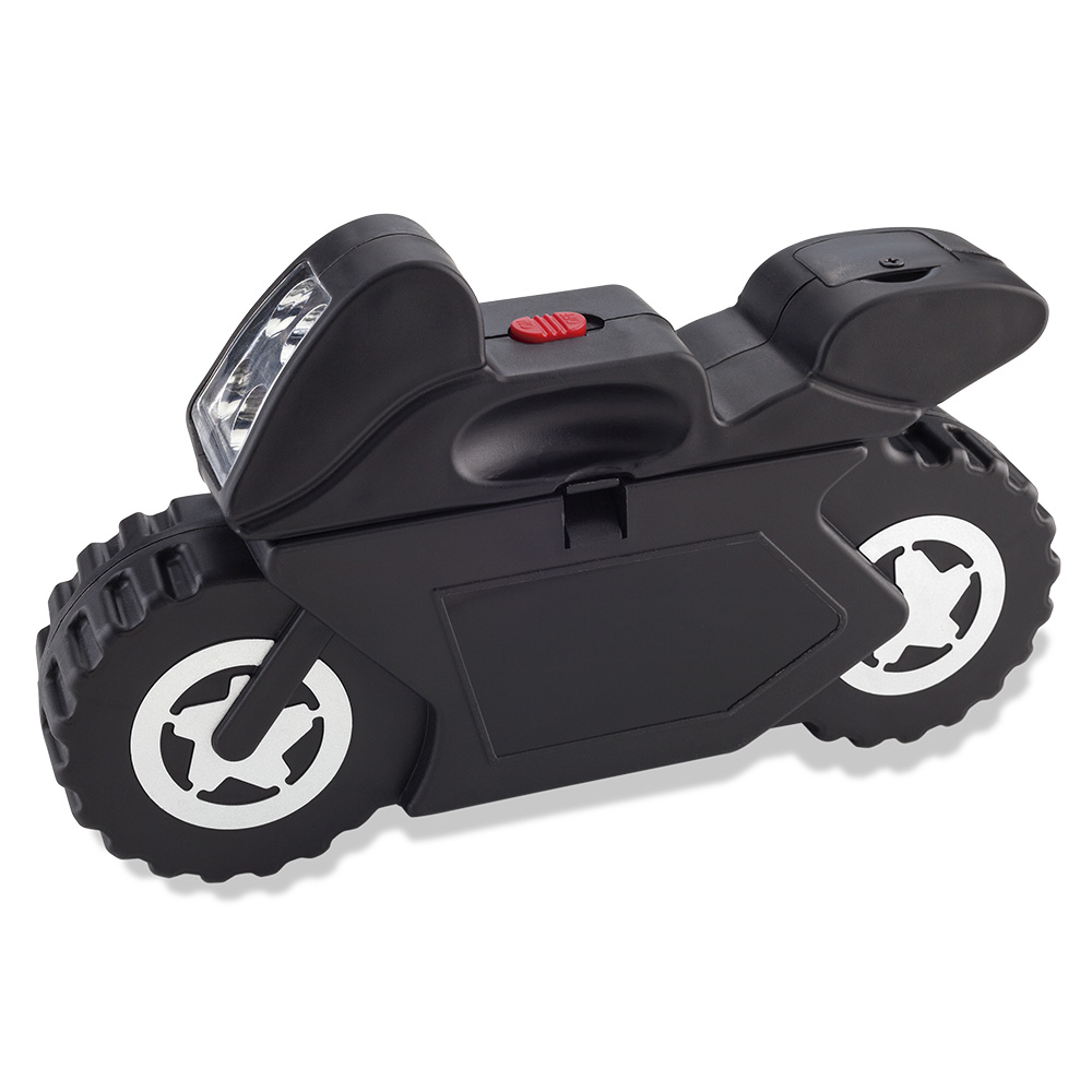 Set de herramientas plástico de 12 piezas, en forma de moto, con linterna. No incluye baterías. Empaque Caja Individual. Medidas Cerrado: 19.5 cm x 12 cm x 4 cm Marca: 4.5 cm / Tampografía