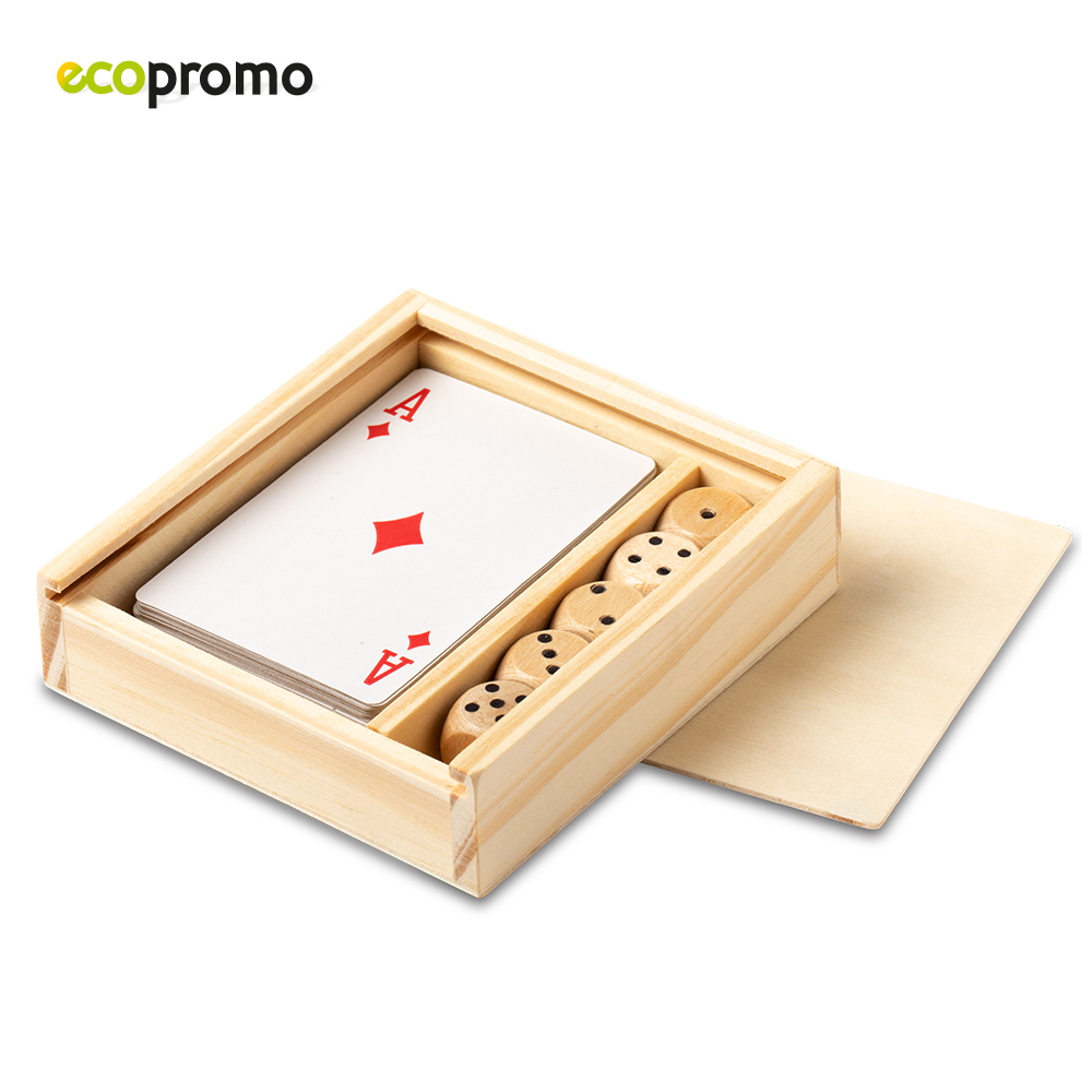 Set de juegos de cartas y juego de dados en estuche de madera con tapa deslizable.