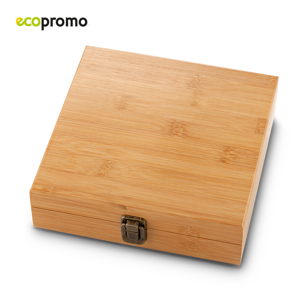 Juego de licorera en acero inoxidable de 177ml de capacidad, dos copas y mini embudo. 1 juego de cartas, 1 juego de dados. Empaque en caja de bambú. Caja individual. Medidas Estuche: 21 cm x 21 cm Marca: 5 cm / Láser