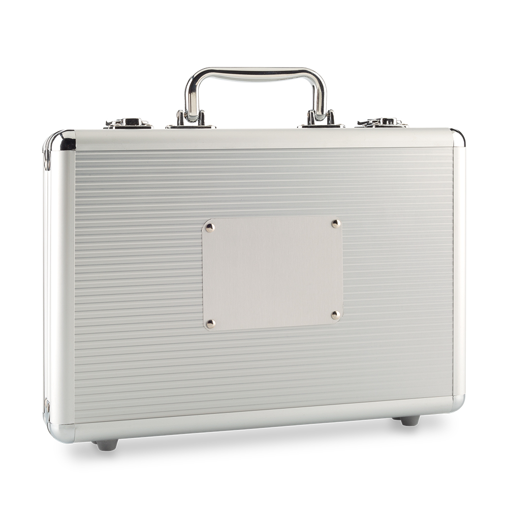 Set de póker en caja de aluminio. Incluye dos naipes de cartas, 5 dados, 200 fichas en cuatro colores y 1 ficha de dealer. Empaque caja individual. Medidas: 30 cm x 20.5 cm x 6 cm. Marca: 6 cm / Láser.