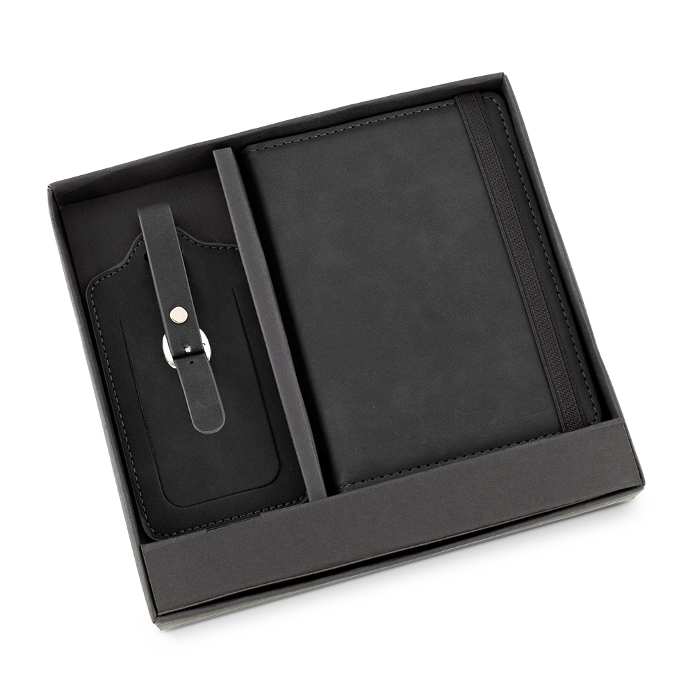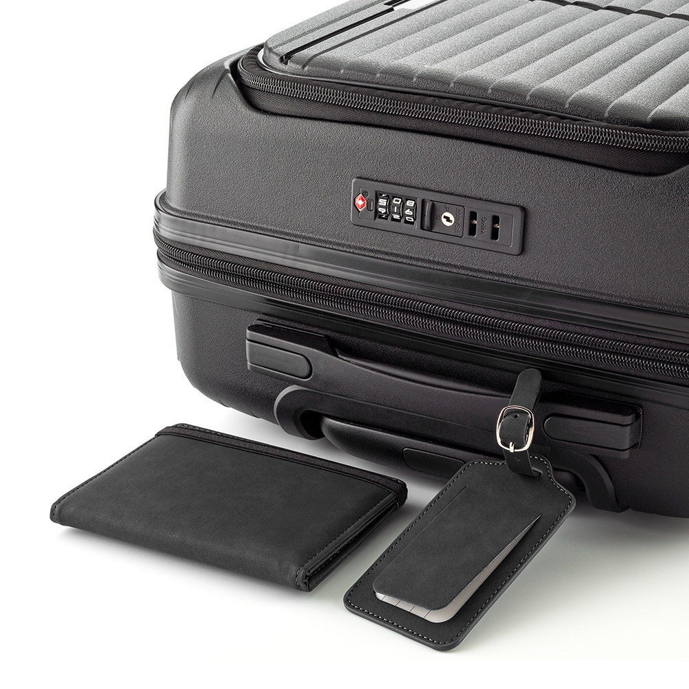 Set de portapasaporte e identificador de maletas en poliuretano. Con 4 portatarjetas, un portadocumentos y dos porta SIM (no incluidas).