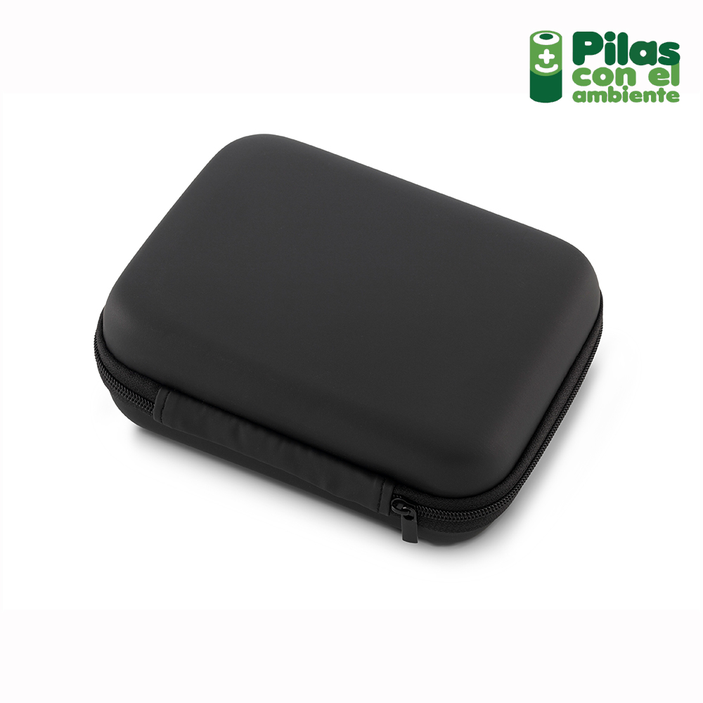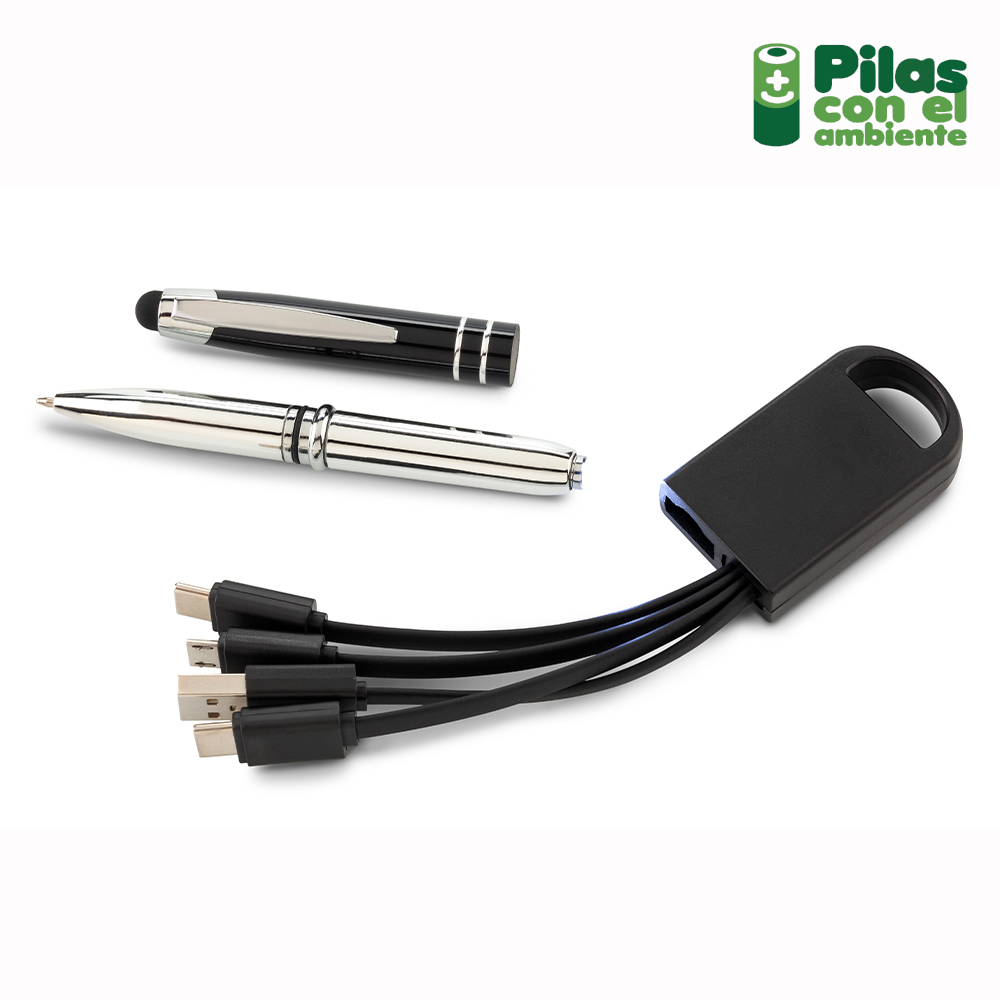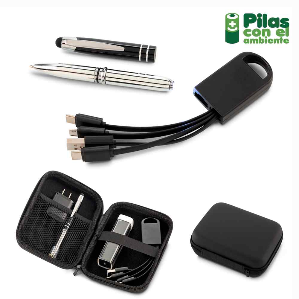Set multifunción para viaje. Incluye una pila recargable de 2200 mAh para teléfonos móviles, un cable muticargador con conectores 2-1 (micro y lighting), Tipo C y Tipo USB, un bolígrafo roller plástico con stylus y un Cargador Tipo USB. Estuche rígido en poliuretano. Empaque caja individual. Medidas Estuche: 16 cm x 12 cm x 5 cm. Marca: 5.5 cm / Tampografía.