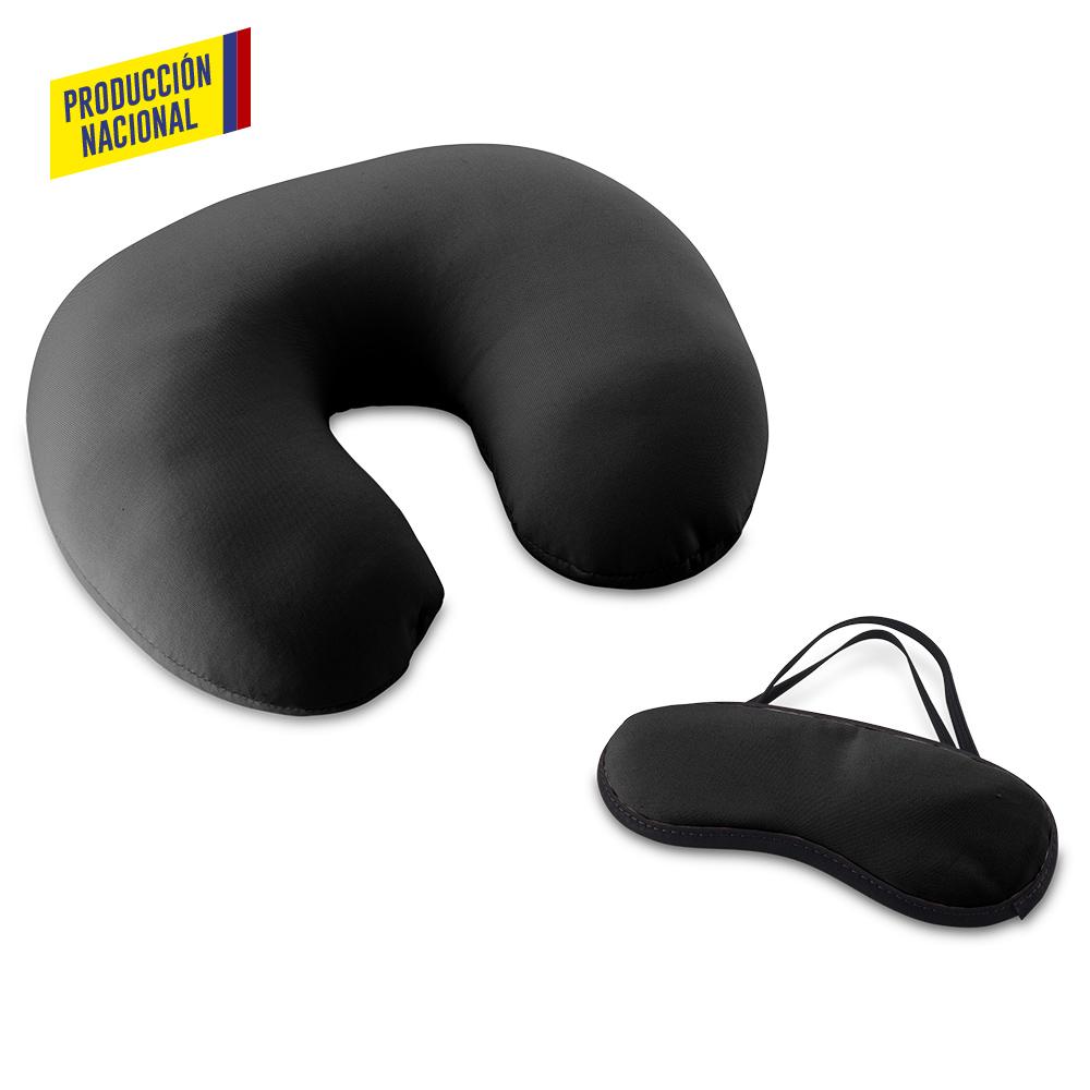 Set de cojín de viaje para cuello con antifaz en tela.
