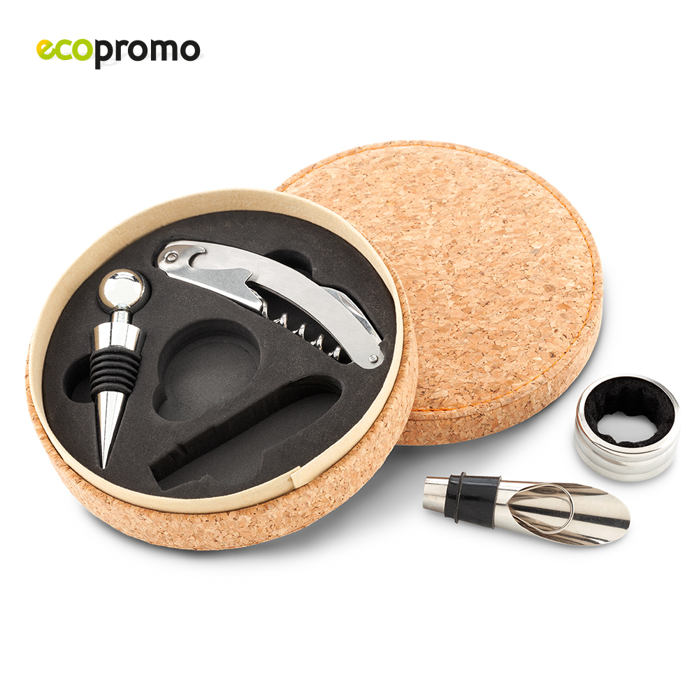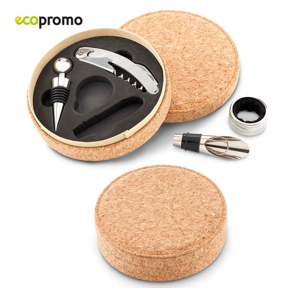 Estuche rígido en corcho con argolla antigoteo, corcho, boquilla y descorchador con navaja de sierra y destapador. Empaque Caja Individual. Medidas Estuche: 4 cm x 14.7 cm diámetro Marca: 5 cm / Láser