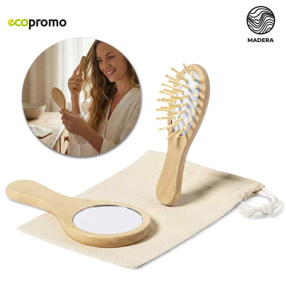 Set de espejo y cepillo en madera natural. Con bolsa en algodón. Artículo para uso personal, no se admiten Cambios/devoluciones.
