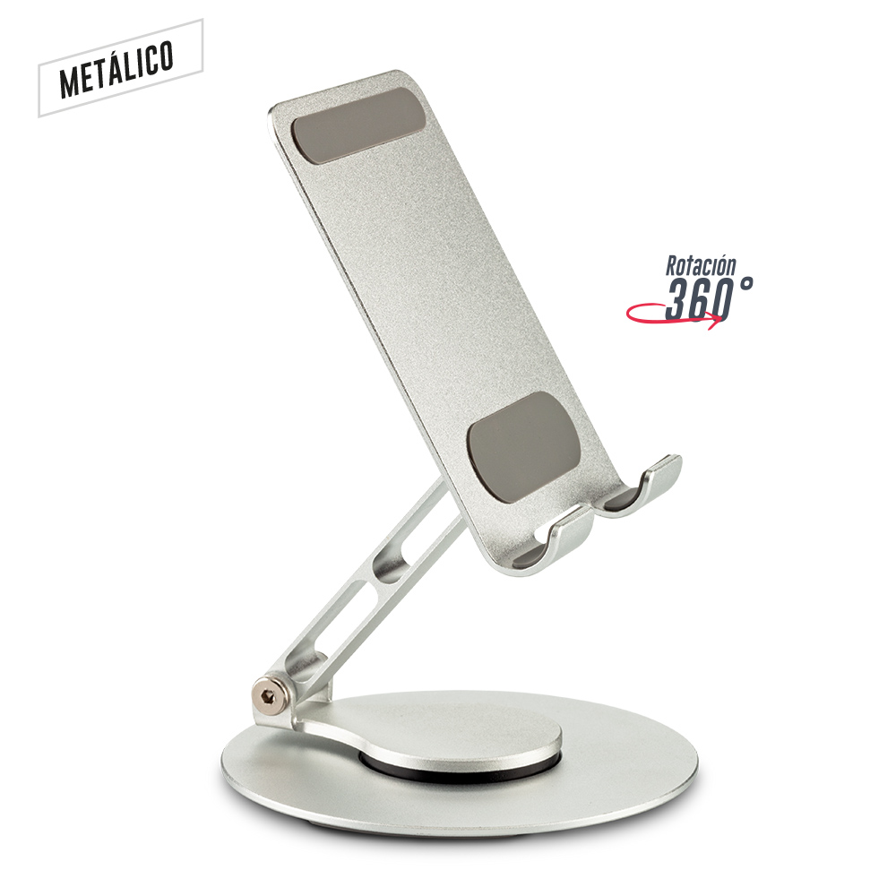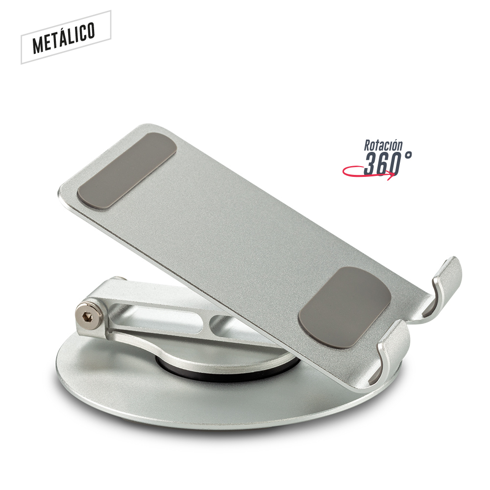 Soporte metálico plegable y escualizable con rotación de 360°. Accesorios antideslizantes en silicona. Empaque caja individual.