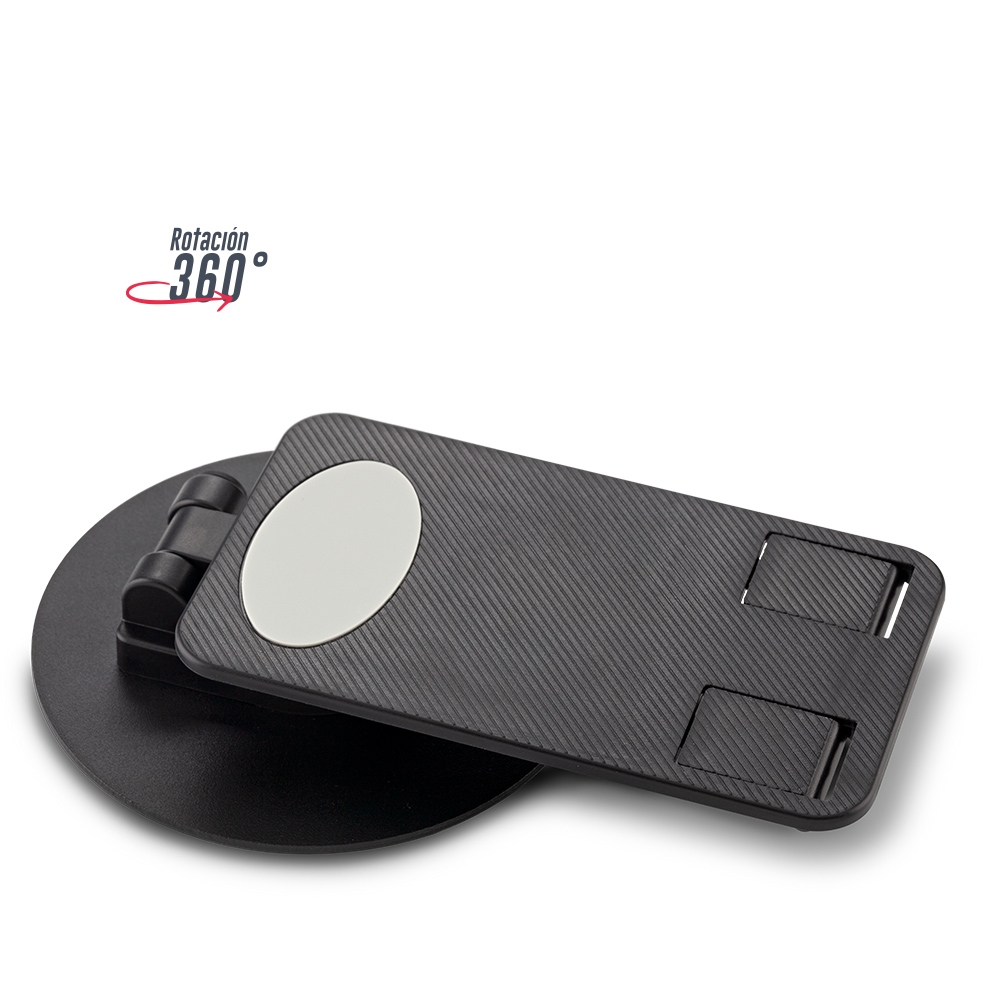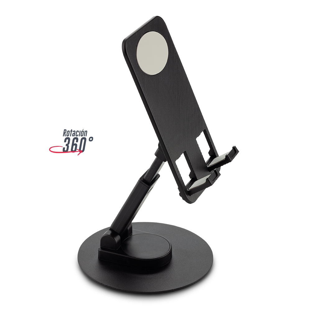 Soporte plástico con base metálica, plegable y escualizable con rotación de 360°. Accesorios antideslizantes en silicona. Empaque caja individual.