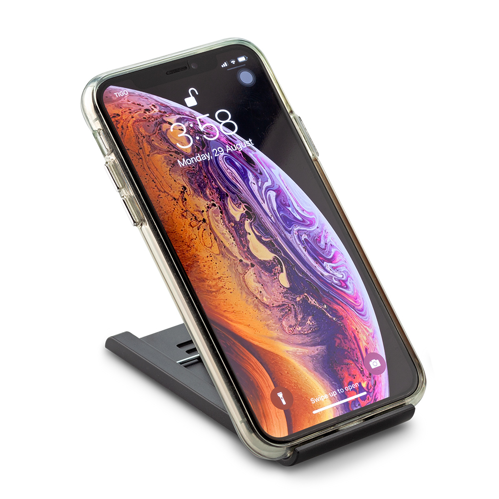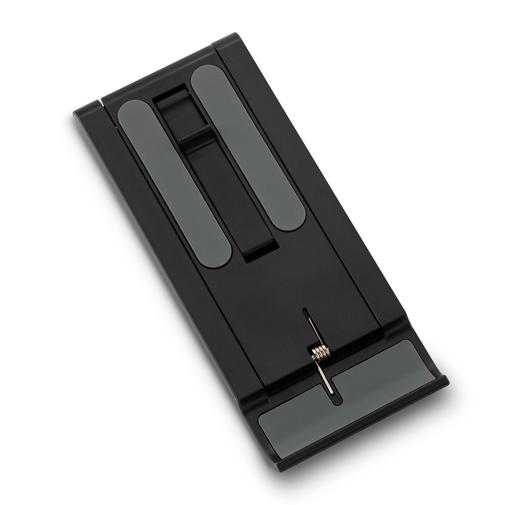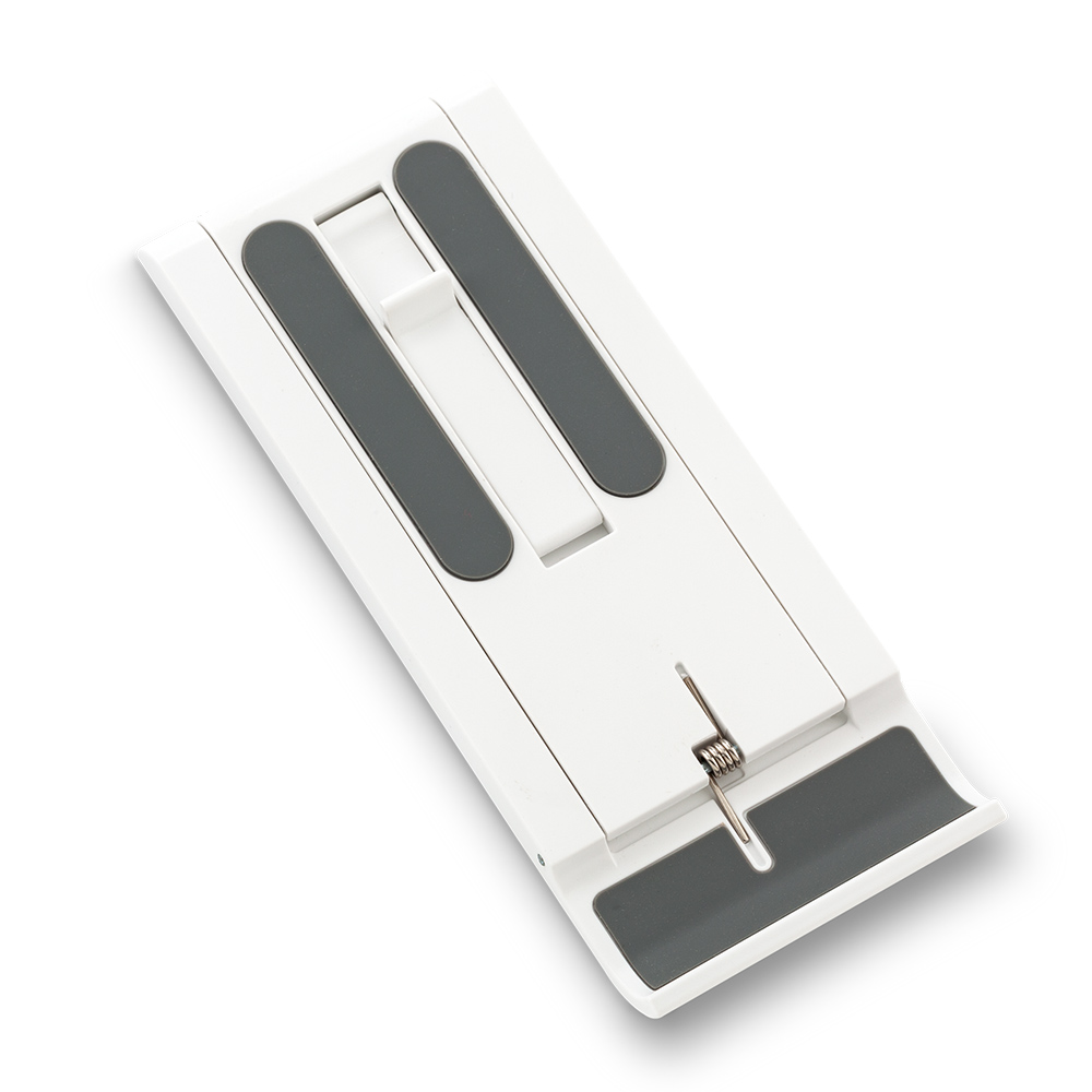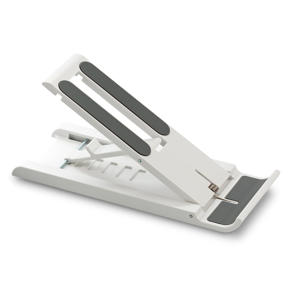 Soporte Portátil plegable plástico. Ligero, con ajuste de altura en la parte posterior y puntas antideslizantes. Se sugiere usar en dispositivos de hasta 7 pulgadas. Empaque caja individual.