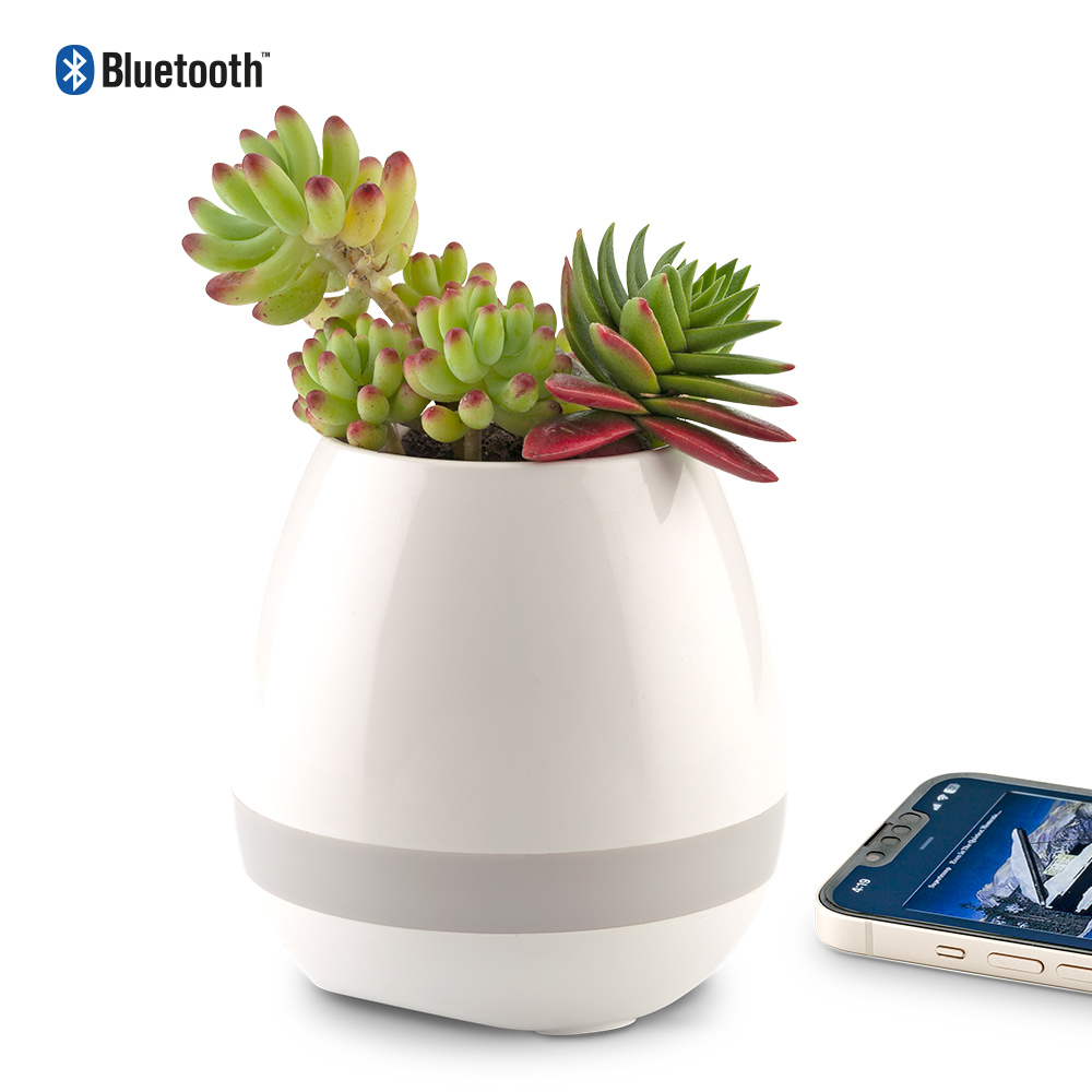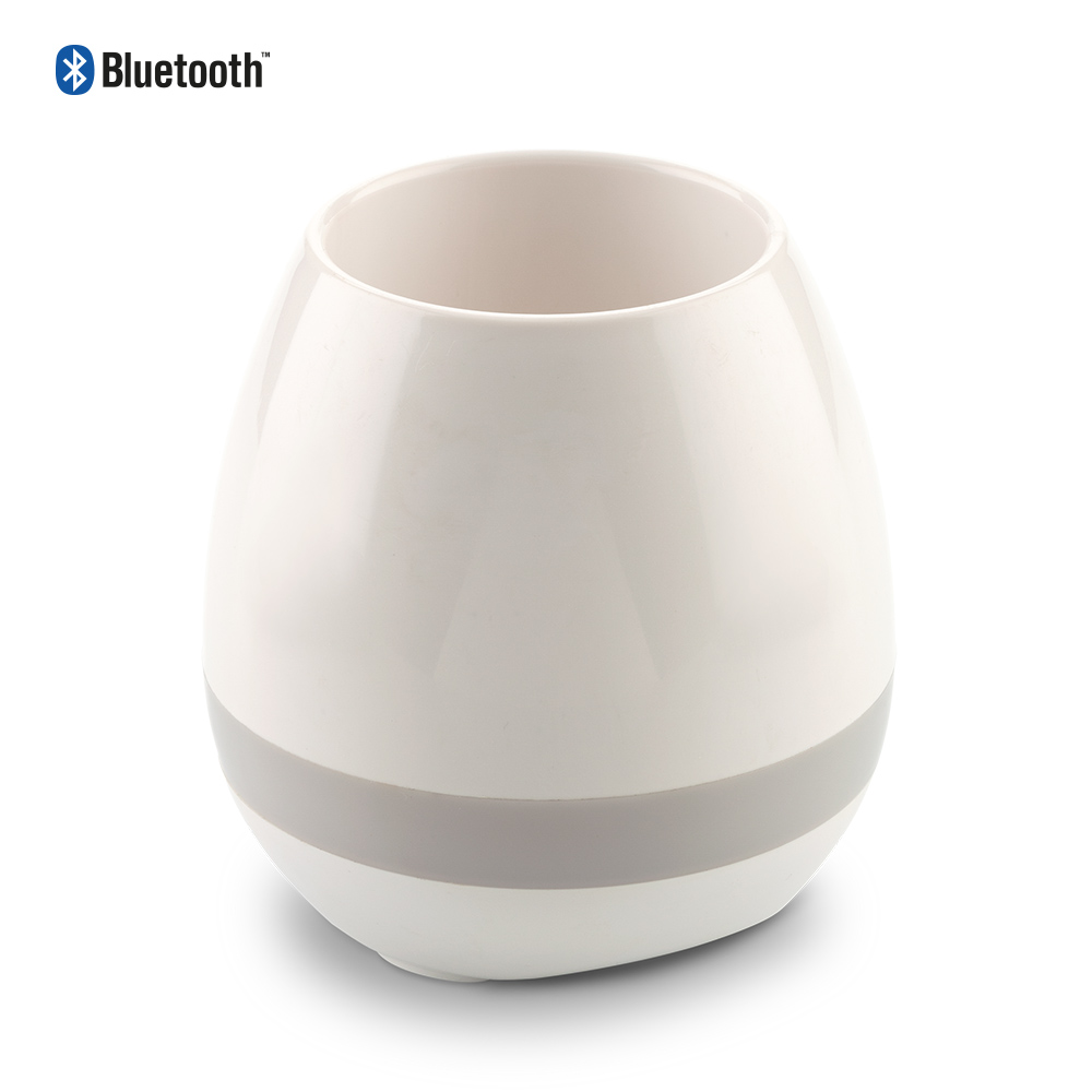 Speaker plástico Bluetooth de 3W con luz LED multicolor y matera para plantas. Funciona como manos libres. Empaque caja individual. Medidas: 11.5 cm x 8 cm diámetro Marca: 5 cm / Tampografía