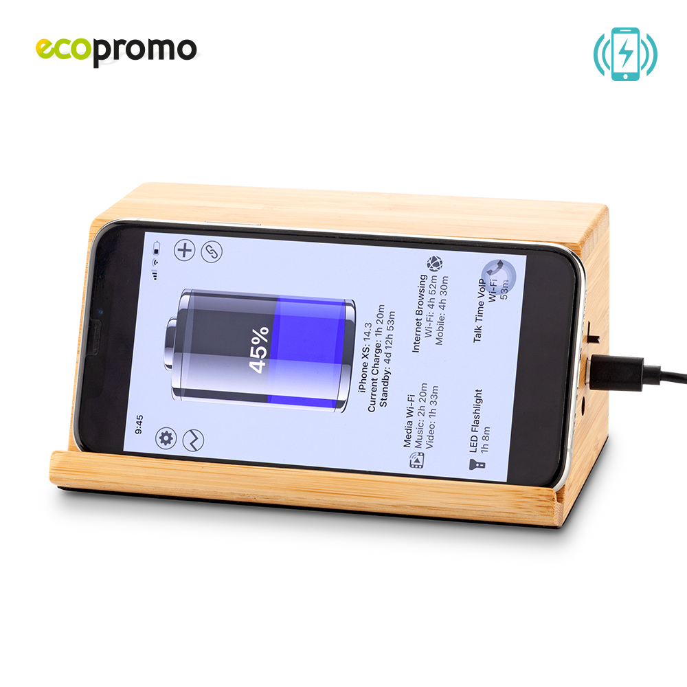 Speaker de inducción 2X3W, no necesita conexión bluetooth, con porta celular y cargador inalámbrico de 10W incorporado. Empaque caja individual.