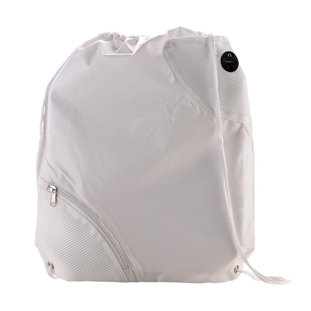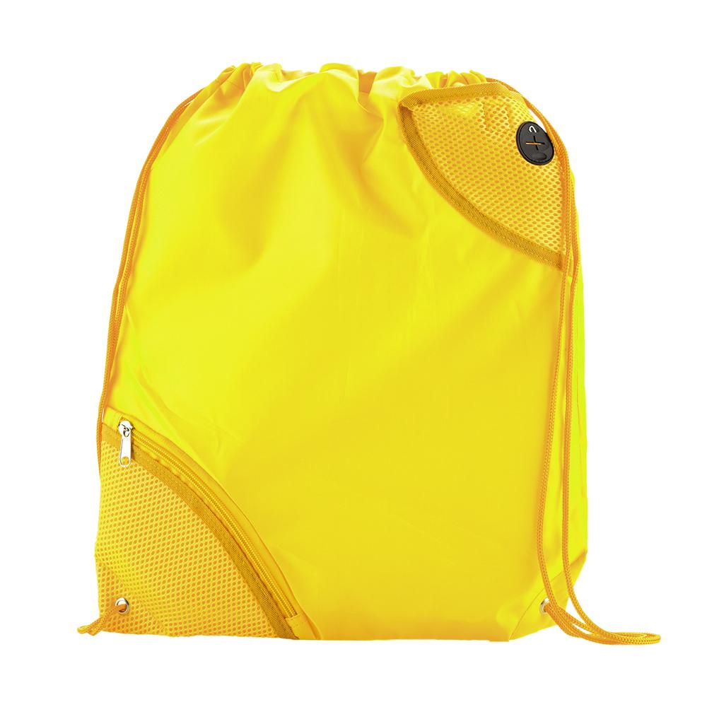 Bolsa tula en poliéster, bolsillo exterior en malla con cremallera y bolsillo exterior con cierre en velcro, cordón para cerrar y cargar.