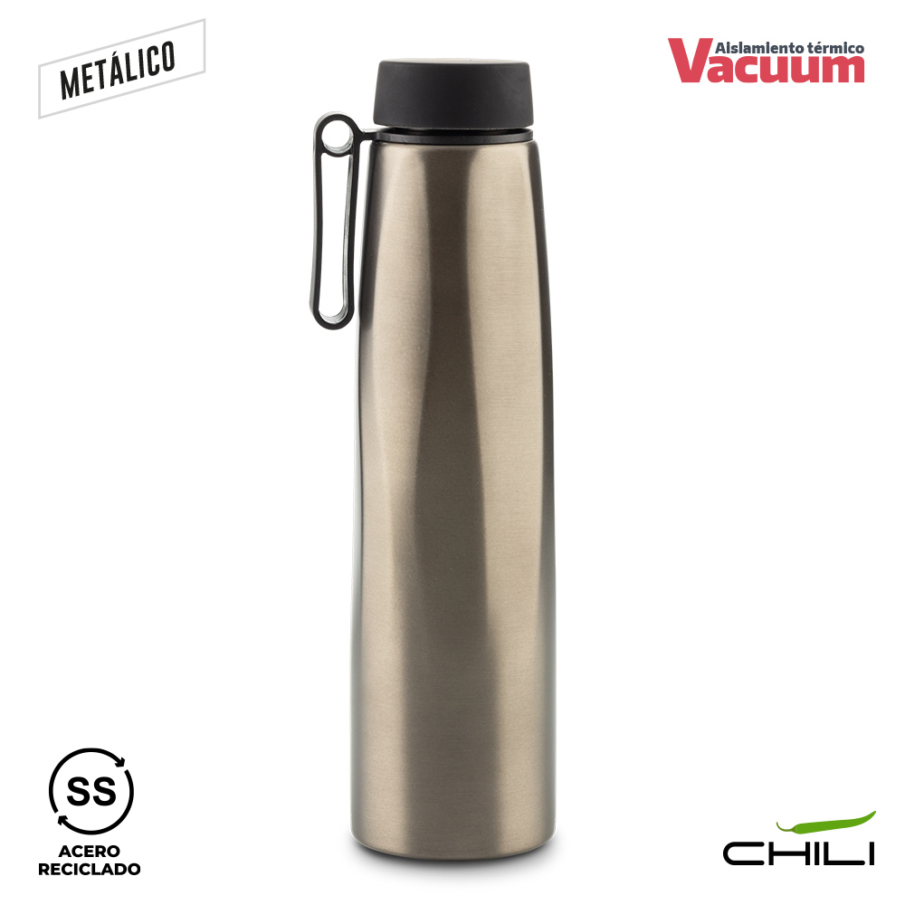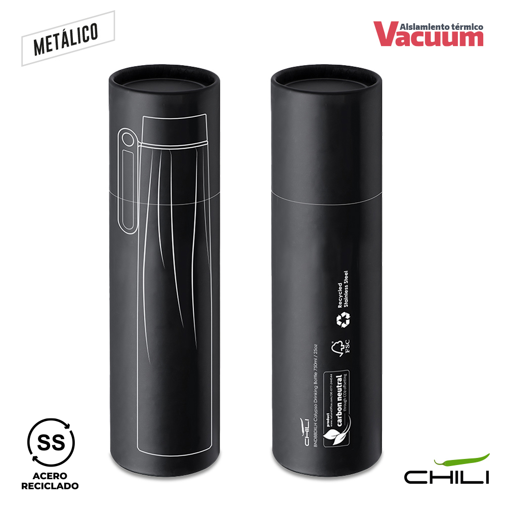 Termo doble pared en acero inoxidable reciclado, con aislamiento térmico que mantiene la bebida fría entre 8-10h aprox o caliente 3-4h aprox (puede variar dependiendo condiciones climáticas). Tapa rosca metálica con recubrimiento en caucho. Carabinero en silicona. Estuche individual tubular en cartón negro.