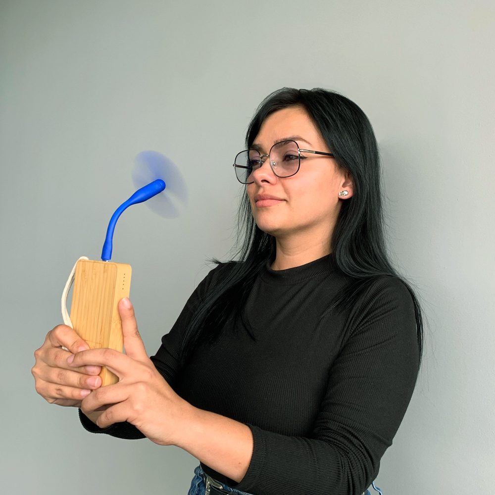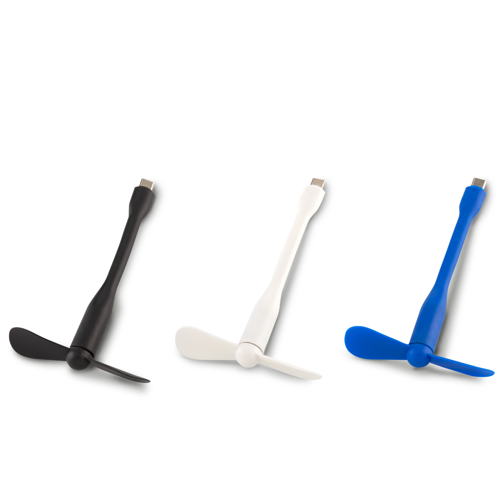 Ventilador en plástico tipo C, flexible de 2 aspas. Medidas: 13.8 cm x 1.4 cm diametro. Marca: 1.5 cm / Tampografía