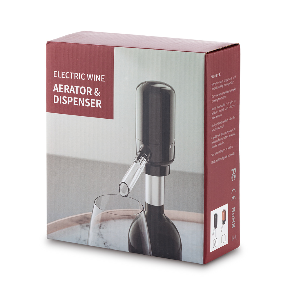 Dispensador de vino que integra el proceso de aireado en un solo producto presionando el botón. 4 pilas AAA no incluidas. Empaque Caja Individual. Medidas:11 cm x4.7 cm diámetro Sin Marca