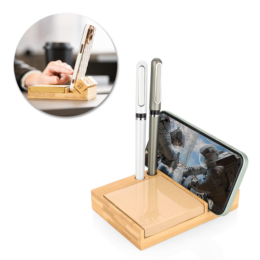 Calendario perpetuo en bambú con porta notas (100 hojas de papel tipo kraft). Empaque caja Individual.