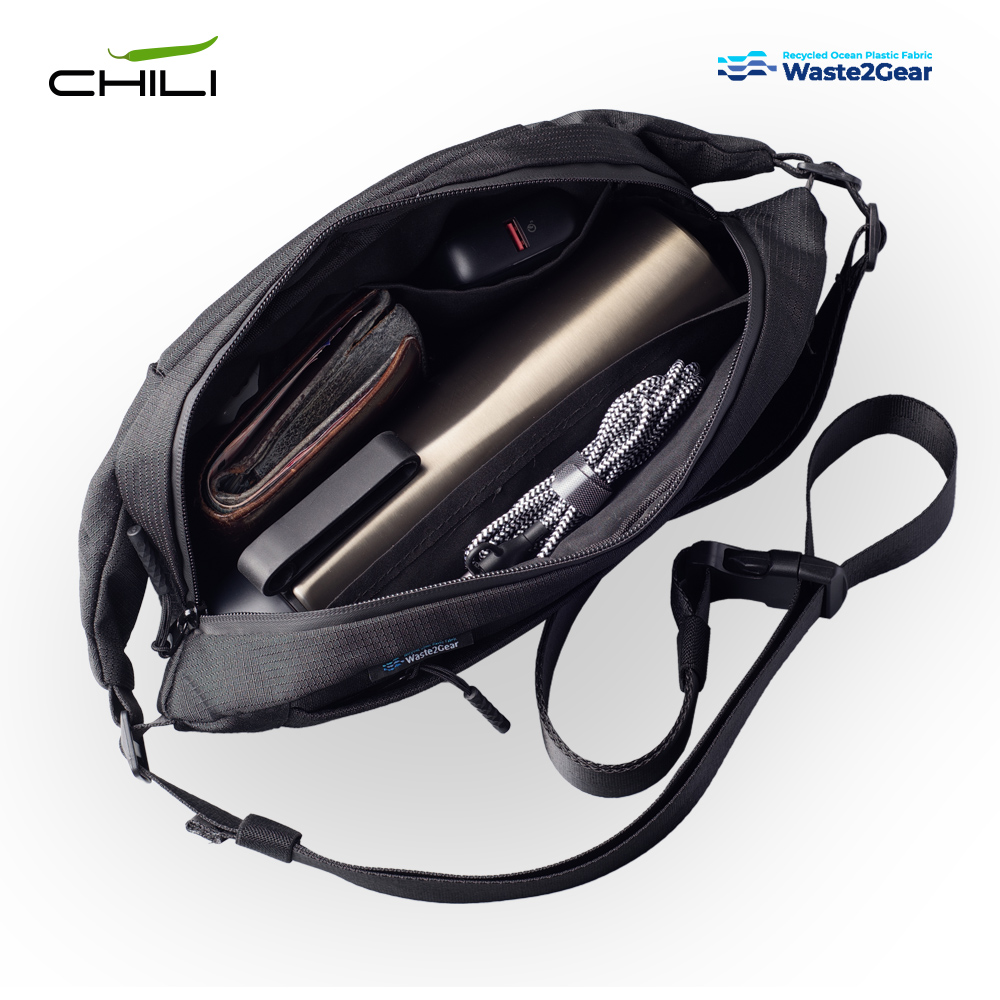Canguro en poliéster reciclado de residuos plásticos recuperados del océano. Tres compartimentos con cierre de cremallera. Incluye placa metálica para marcar. Medidas: 28 cm x 14 cm x 8 cm . Marca: 3 cm / Láser