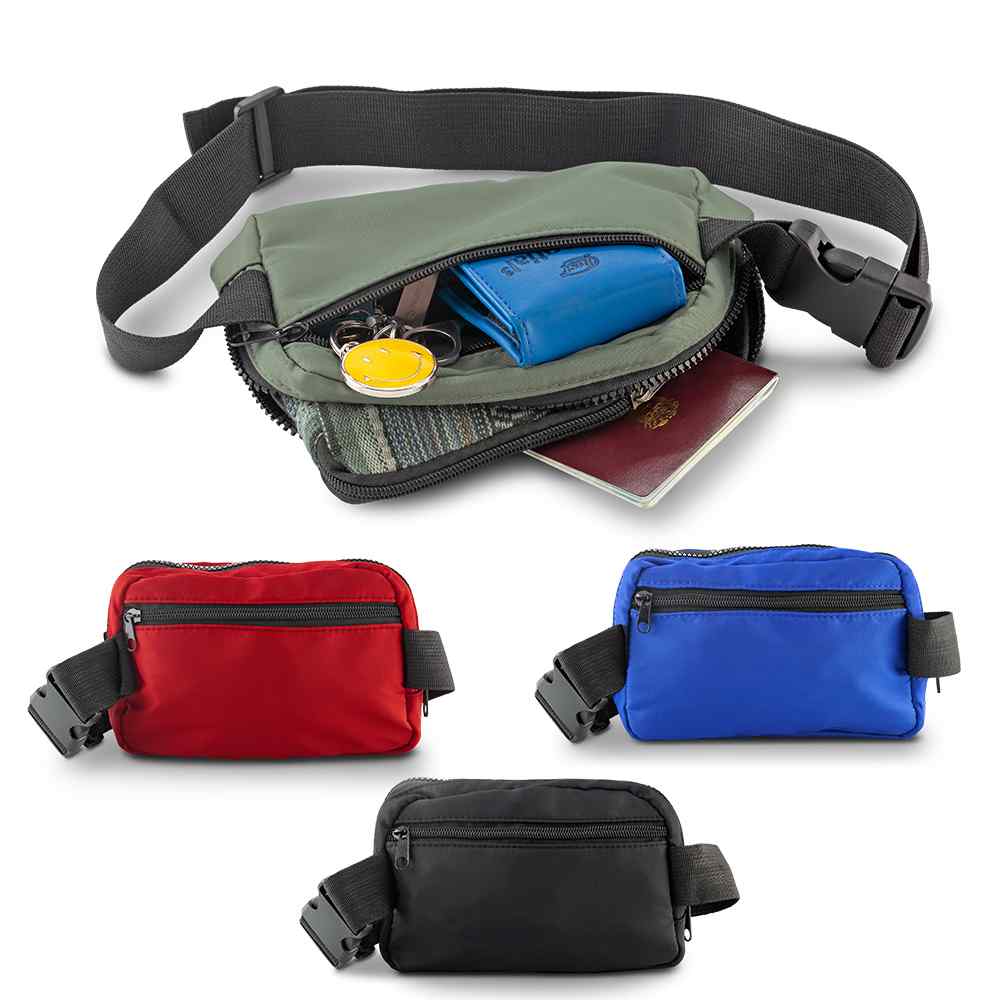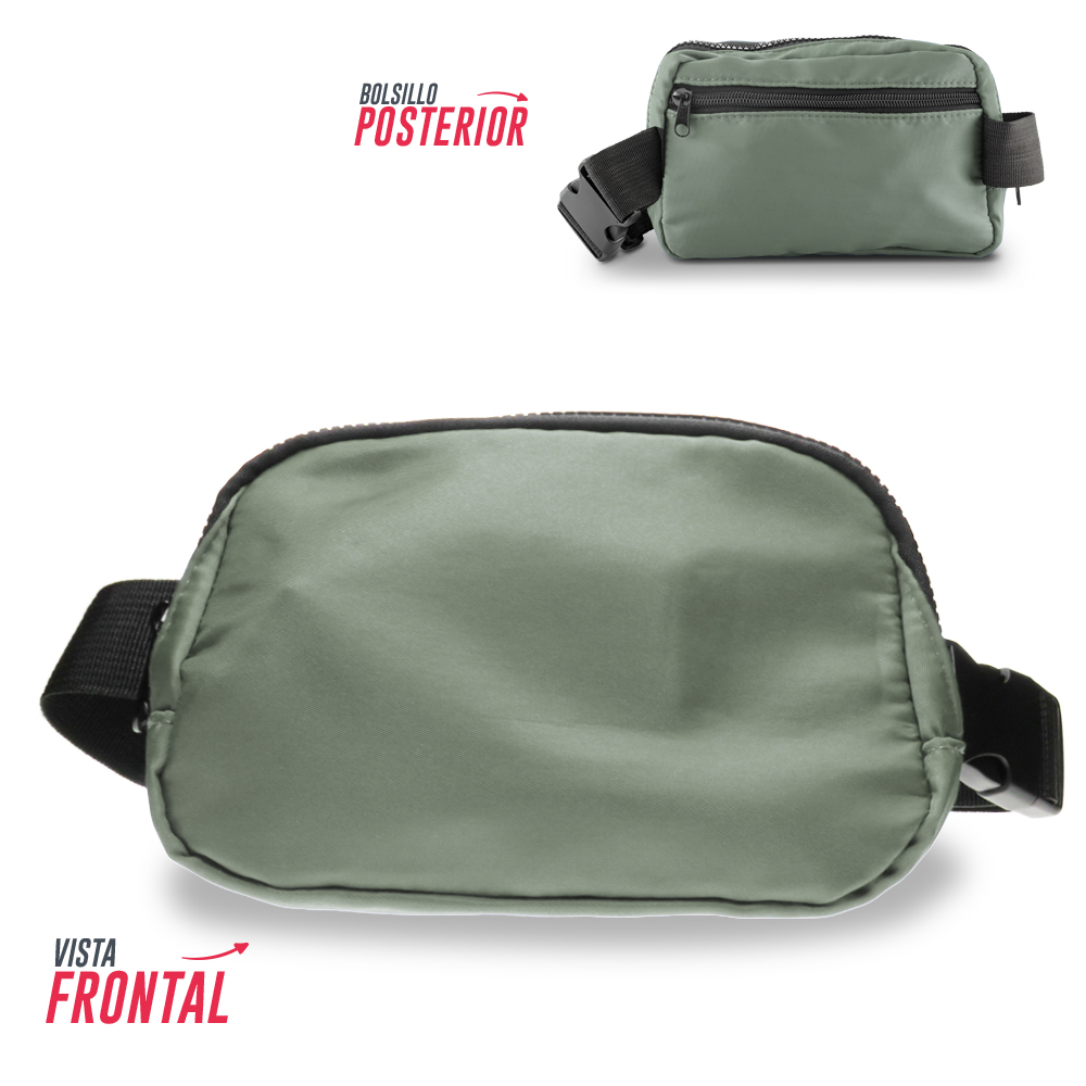 Canguro en poliéster. Con bolsillo posterior con cremallera.