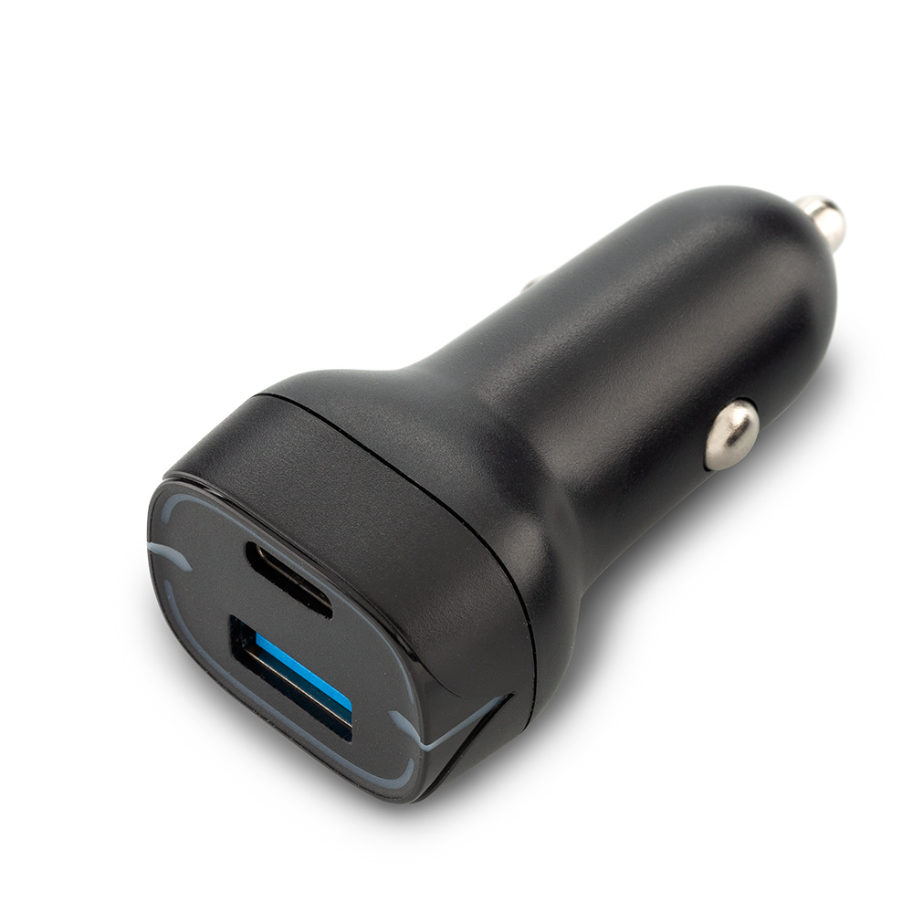 Cargador plástico dual para carro, con puertos USB y Tipo C. Empaque caja individual.