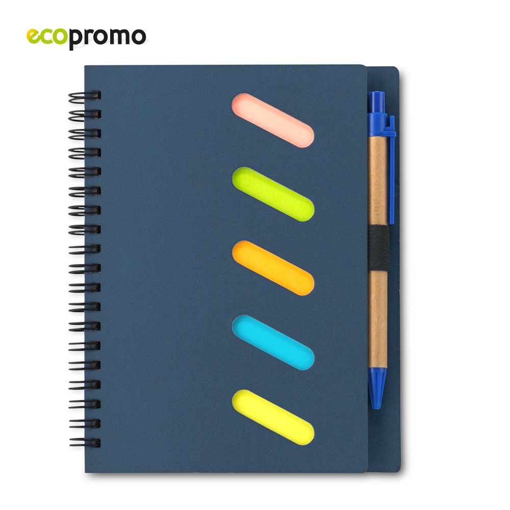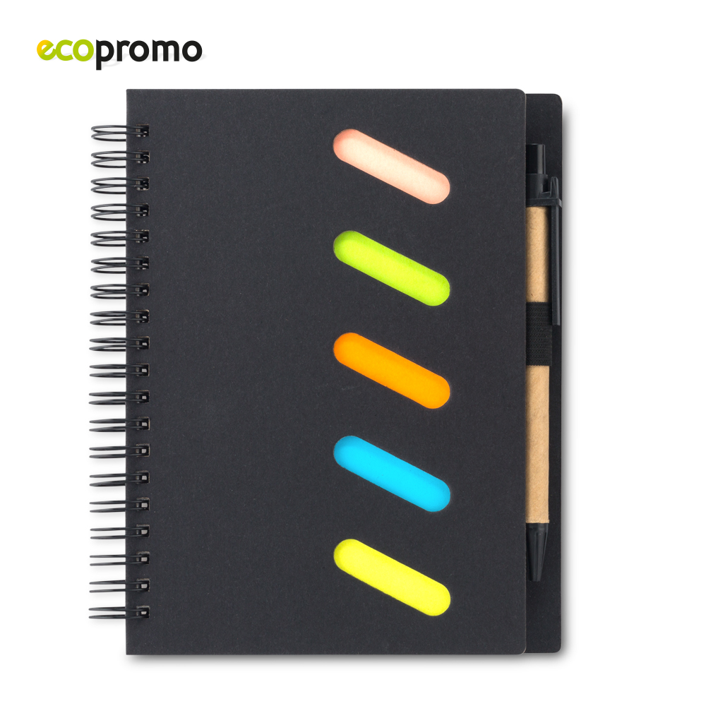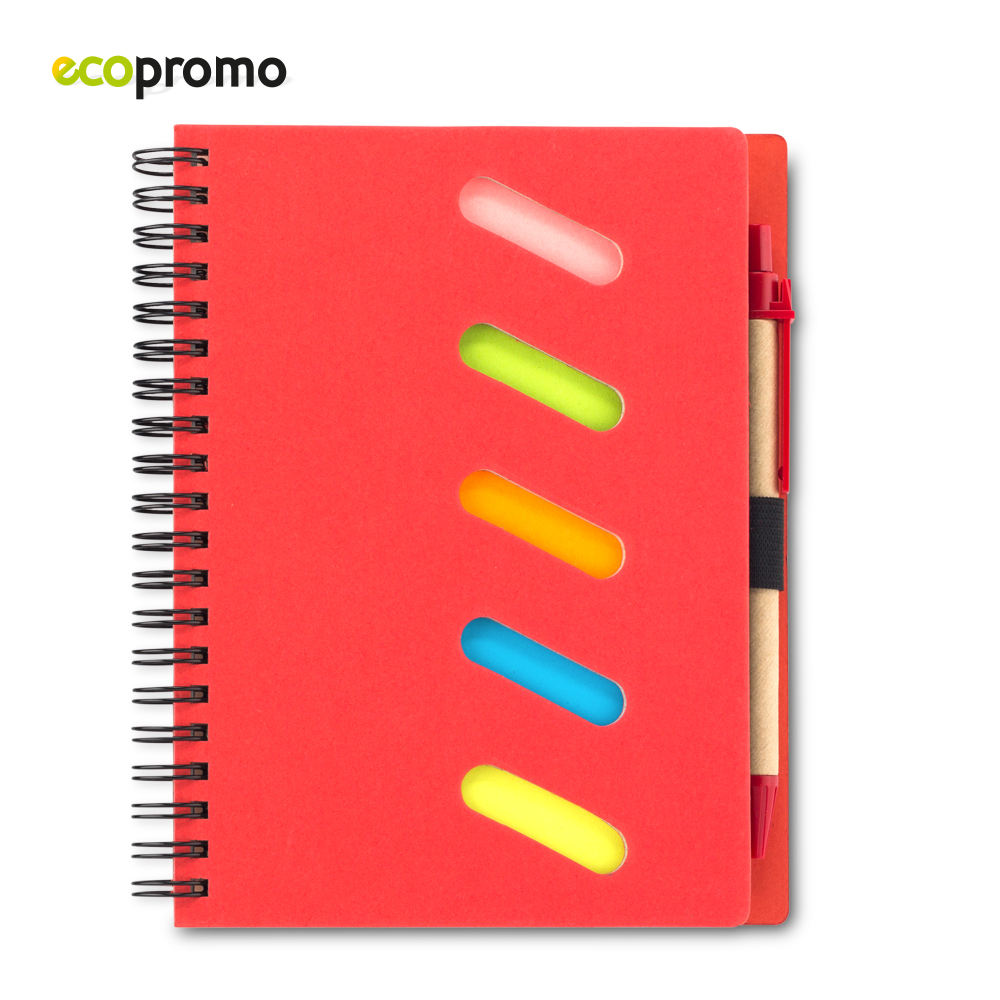 Libreta doble argolla y bolígrafo de cartón. 50 hojas. Cinco stickies de colores – 20 hojas cada uno. Medidas: 13.6 cm x 18 cm Marca: 4 cm / Tampografía