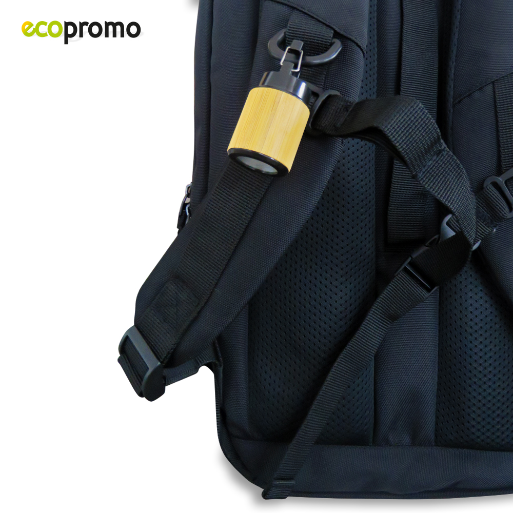 Linterna en bambú con mosquetón en plástico.3 LEDs. Sistema de encendido de botón. Empaque caja individual. Medidas: 6.6 cm x 2.8 cm diámetro. Marca: 1.5 cm /Tampografía / Láser