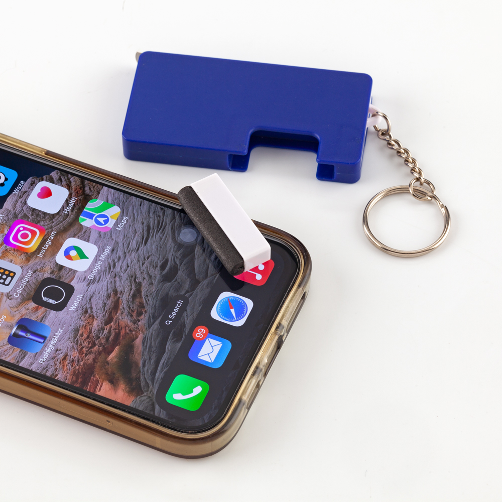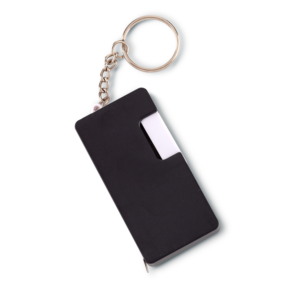 Llavero plástico con metro de 1 mt, soporte para celular y limpia pantallas. Medidas: 7 cm x 3.5 cm x 1 cm. Marca: 3 cm / Tampografía.