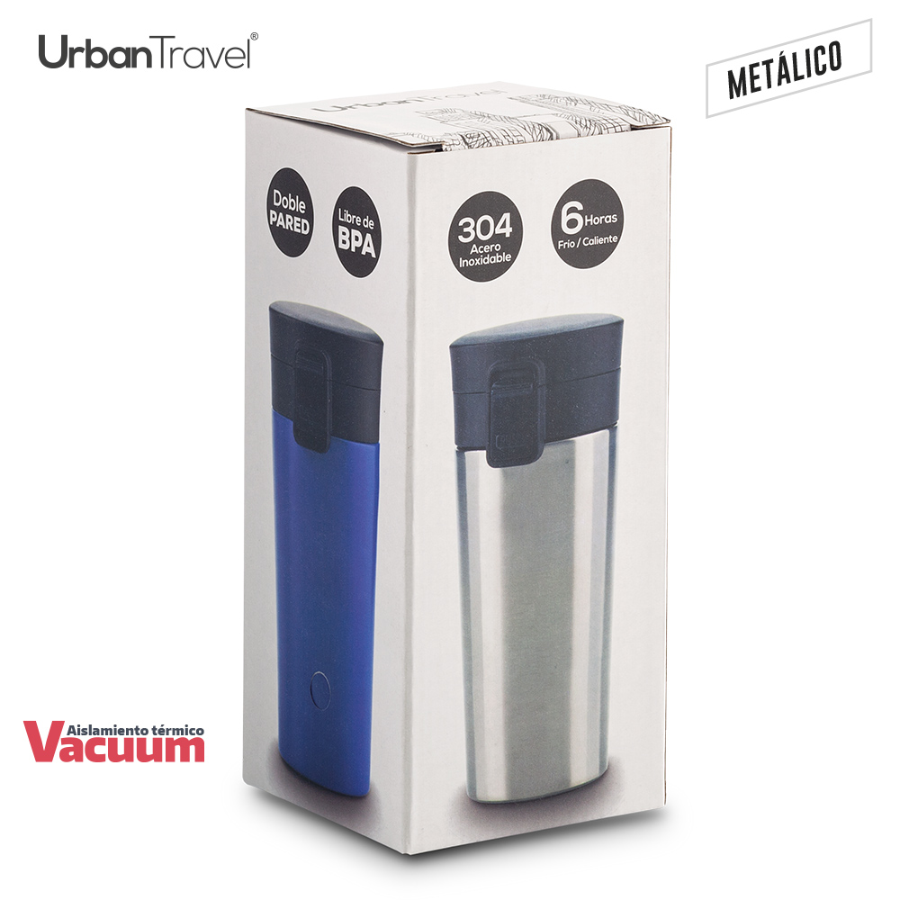 Doble pared en acero Inoxidable, con aislamiento térmico que mantiene la bebida fría o caliente hasta 6h, aprox (puede variar dependiendo condiciones climáticas). Tapa tipo lock y filtro metálico interno. Empaque caja individual.