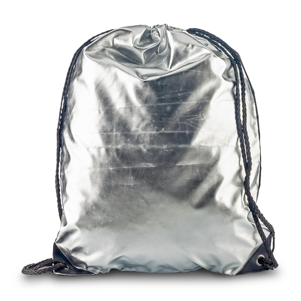 Poliéster metalizado en la parte frontal. Cambrel Negro en la parte posterior. Cordón para cargar y cerrar. Medidas:44.5 cm x 33.5 cm Marca:25 cm/Screen